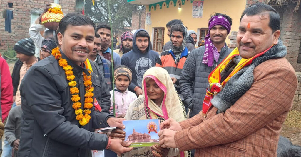 जानकारी के अनुसार अयोध्या से आयी कलश यात्रा के दौरान आये अक्षतों का नगर पंचायत अध्यक्ष अनिल कुमार राजपूत ने सभासदों के साथ घर-घर जाकर वितरण किया। साथ ही उन्होंने जनमानस से अपील की ऐसी शुभ घड़ी 500 साल बाद आयी है। इसलिए सभी लोग खुशियां मनायें, घरों में दीप जलायें तथा भजन कीर्तन करें। उन्होंने कहा कि भाजपा शासनकाल मेंं अयोध्या में भव्य राममंदिर बनने का सपना साकार हुआ है। जो सभी के लिए एक गौरव की बात है। अक्षत का वितरण गांव सलेमपुर में किया गया। इस दौरान नगर पंचायत अध्यक्ष के साथ क्षेत्र के कई सभासद मौजूद रहे। नगर पंचायत अध्यक्ष का कई स्थानों पर फूल-माला पहनाकर स्वागत किया गया। इस दौरान ग्रामीणों ने उन्हें अपनी समस्याओं से भी रुबरु कराया। इस मौके पर संघ के पदाधिकारी ठाकुर वीरपाल सिंह, अनुज कुमार, इरफान सिद्दीकी तथा दर्जनों की संख्या में भाजपाई पदाधिकारी उनके साथ मौजूद रहे।