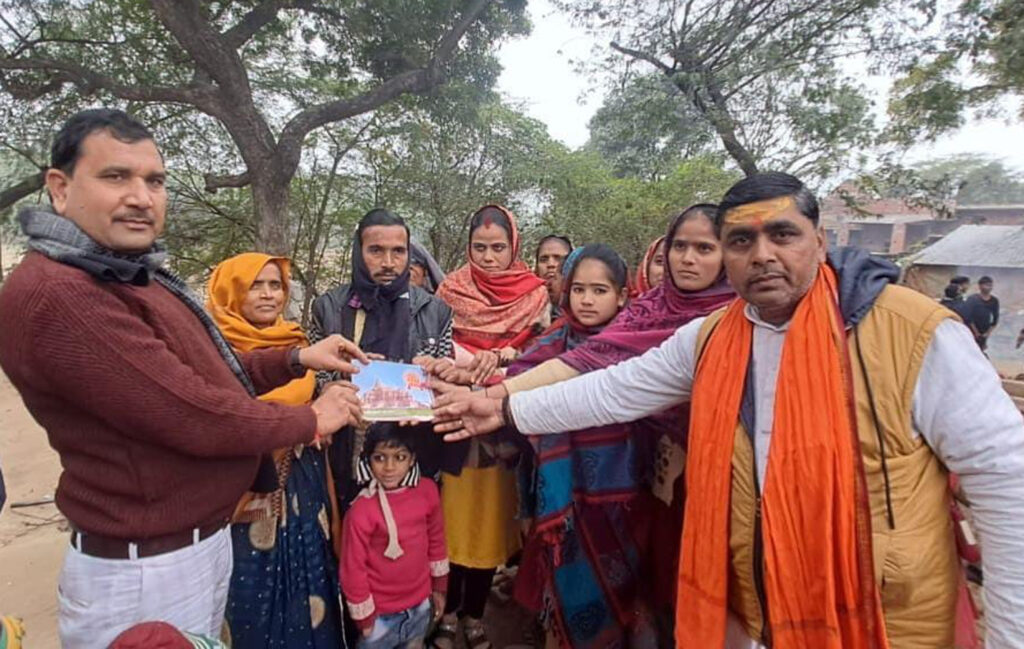 जानकारी के अनुसार अयोध्या से आयी कलश यात्रा के दौरान आये अक्षतों का नगर पंचायत अध्यक्ष अनिल कुमार राजपूत ने सभासदों के साथ घर-घर जाकर वितरण किया। साथ ही उन्होंने जनमानस से अपील की ऐसी शुभ घड़ी 500 साल बाद आयी है। इसलिए सभी लोग खुशियां मनायें, घरों में दीप जलायें तथा भजन कीर्तन करें। उन्होंने कहा कि भाजपा शासनकाल मेंं अयोध्या में भव्य राममंदिर बनने का सपना साकार हुआ है। जो सभी के लिए एक गौरव की बात है। अक्षत का वितरण वार्ड संख्या-०७ रानी अवंतीबाई नगर, नगला हीरा सिंह में किया गया। इस दौरान नगर पंचायत अध्यक्ष के साथ क्षेत्र के कई सभासद मौजूद रहे। नगर पंचायत अध्यक्ष का कई स्थानों पर फूल-माला पहनाकर स्वागत किया गया। इस दौरान ग्रामीणों ने उन्हें अपनी समस्याओं से भी रुबरु कराया। इस मौके पर कुलदीप राजपूत सभासद, वीर सिंह एवं समस्त राम भक्तों ने ढोल नगाड़ों के साथ श्रद्धाभाव से घर-घर दस्तक दी।