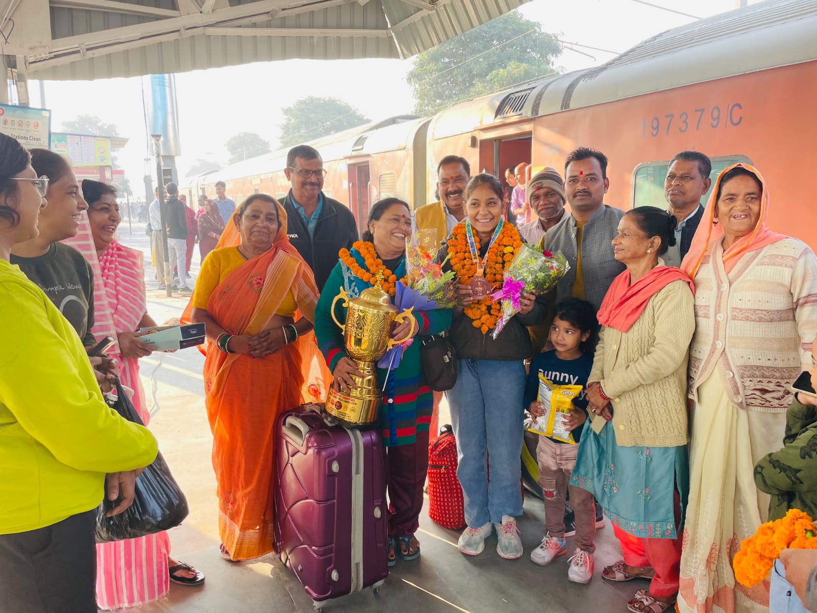 बताते चलें कि सिक्किम के गंगटोक में 35 वीं राष्ट्रीय स्ट्रेंथ लिफ्टिंग महिला/ पुरुष सब जूनियर, जूनियर,सीनियर दिव्यांग,एवम इंक्लिन बेंच प्रेस प्रतियोगिता आयोजित हुई थी। जिसमें अंतरराष्ट्रीय खिलाड़ी व कोच पूनम तिवारी के नेतृत्व में जिले से सब जूनियर भार वर्ग में 58 किलो भार वर्ग में अंजलि ने कर्लिंग 20किलो और हैक लिफ्ट में 97.5किलो भार उठाकर भारत में कांस्य पदक प्राप्त किया था।नेशनल चैंपियनशिप में मेडल हासिल कर रविवार की सुबह जैसे ट्रेन हरदोई रेलवे स्टेशन पहुंची। विजेता खिलाड़ी के परिजन भी फूल- माला लेकर रेलवे स्टेशन पर पहुंच गए और उन्होंने कोच और विजेता खिलाड़ी का फूल -मालाओं से भव्य स्वागत किया।लड्डू खिलाकर सभी का मुंह मीठा कराया।कोच ने बताया कि अंजलि शंकर व्यायाम शाला में नियमित अभ्यास करती हैं। इस मौके पर अंतर्राष्ट्रीय खिलाड़ी डॉ राजधर मिश्रा,अंजलि के पिता अजय कनौजिया,निखिल कनौजिया,आयुष कश्यप,प्रियांशु सिंह यादव,कृष्णेन मिश्रा सहित अन्य लोग मौजूद रहे।