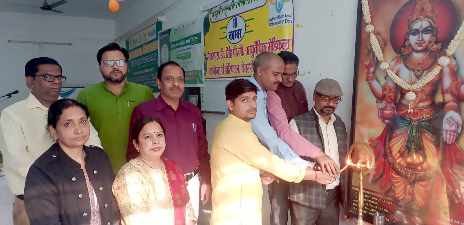 कार्यक्रम के अतिथि एवं शिवाय योगपीठ एवं पोषण विज्ञान केन्द्र के संस्थापक योगाचार्य अमित सक्सेना ने कार्यक्रम को सम्बोधित करते हुए कहा कि जीवाणु शरीर में जीवनी शक्ति के कमजोर होने पर विजातीय पदार्थों के जमाव होने पर ही आक्रमण कर पाते हैं। जब शरीर में उनके रहने और पनपने लायक अनुकूल वातावरण तैयार हो जाता है। अत: मूल कारण विजातीय पदार्थ है, जीवाणु नहीं। जीवाणु द्वितीय कारण है। प्रकृति स्वयं सबसे बड़ा चिकित्सक है। शरीर में स्वंय को रोगों से बचाने व अस्वस्थ हो जाने पर पुन: स्वास्थ्य प्राप्त करने की क्षमता विधमान है। इसमें केवल रोग की नहीं बल्कि रोगी के पूरे शरीर की होती है। मनुष्य के शरीर में स्वंय को रोग मुक्त करने को अपूर्व शक्ति है।राजकीय योग वेलनेस सेण्टर के योगाचार्य अंकुर द्विवेदी ने कार्यक्रम को सम्बोधित करते हुए कहा कि प्राकृतिक चिकित्सा में विभिन्न विधियां आहार चिकित्सा, उपवास चिकित्सा, मिट्टी चिकित्सा, जल चिकित्सा, मालिश चिकित्सा, सूर्य किरण चिकित्सा, वायु चिकित्सा, क्षेत्रीय वनौषधियां का बिना दुष्प्रभाव प्रयोग होता है। जिसमें मुख्य उपचार मिट्टी की पट्टी, मिट्टी का स्नान, सूर्य स्नान, गर्म और ठंडा सेंक, कटी स्नान, मेहन स्नान, पैर हाथ का गर्म सेंक, वाष्प स्नान, पूर्ण टब स्नान, रीढ़ स्नान सर्वांग गीली चादर लपेट, छाती की पट्टी व घुटने की पट्टी, एनिमा, जलनेती, वमन, माथे की पट्टी, पेट की पट्टी रोगानुसार मालिश की क्रियाएं की जाती है। यह सरल सहज, उपचार की प्रक्रिया है जिसे हमें जीवन में अपनानी चाहिए। इससे पूर्व मुख्य अतिथि एवं अतिथिगणों ने भगवान धन्वन्तरि के चित्र के समक्ष दीप प्रज्जवलित कर कार्यक्रम का शुभारंभ किया। कार्यक्रम को प्राचार्य डॉ0 सुनील कुमार गुप्ता, उप प्राचार्य डॉ0 जॉली सक्सेना, उप चिकित्सा अधीक्षक डॉ0 नीतू श्री ने भी सम्बोधित किया। कार्यक्रम का संचालन स्वस्थवृत्त विभाग के कार्यकारी विभागाध्यक्ष डॉ0 अरुण कुमार पाण्डेय ने किया। इस अवसर पर डॉ0 अंकुर सक्सेना, डॉ0 संकल्प सिंह आदि की उपस्थिति उल्लेखनीय रही।