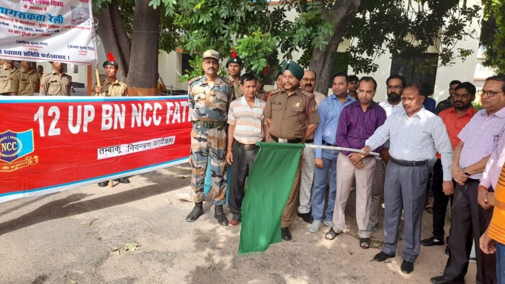 फर्रुखाबाद, समृद्धि न्यूज। विश्व तम्बाकू निषेध दिवस के उपलक्ष्य में जिलाधिकारी संजय कुमार सिंह ने ब्रह्मदत्त स्टेडियम में जागरुकता रैली को हरी झंडी दिखाकर रवाना किया। स्टेडियम में ढोल नगाड़ों के साथ स्लोगन लिखी पट्टिका लेकर विद्यार्थी व एनसीसी कैडेटों ने नारे लगाकर तम्बाकू का सेवन करने वालों को जागरुक किया। उन्होंने कहा कि स्वास्थ्य के लिए तम्बाकू हानिकारक है। जिन्दगी जीने के लिए भोजन की जरुरत है, तम्बाकू की नहीं। स्टेडियम में अपर जिलाधिकारी व मुख्य चिकित्साधिकारी अवनींद्र कुमार, एनसीसी १२ यू.पी. बटालियन के कमांडिंग आफीसर कर्नल रोमिल सिहं के निर्देशन में एजूडेंट कैप्टन बलविन्दर सिंह के नेतृत्व में लगभग ५० से ज्यादा एनसीसी कैडेटों ने प्रतिभाग किया। तम्बाकू को छोड़ो जीवन को बचाओ। तम्बाकू की आदत यानी कैंसर को दावत। तम्बाकू को खाना है तो कैंसर को बुलाना है, आदि नारे लगाये गये। इस अवसर पर सूबेदार भीम सिंह, हवलदार वी.पी.राना ने कैडेटों के साथ रैली में प्रतिभाग करते हुए लोगों को जागरुक किया और तम्बाकू खाने वालों से इसे छोडऩे की अपील की। स्टेडियम में विभिन्न विद्यालयों के छात्र-छात्राओं, एनसीसी कैडेटों ने फतेहगढ़ नगर में घूमकर तम्बाकू निषेध दिवस पर लोगों को जागरुक किया। इस दौरान बड़ी संख्या में लोग मौजूद रहे। साथ ही तम्बाकू नियंत्रण के लिए जनपद में विभिन्न जगह व विद्यालयों में कार्यक्रम का आयोजन हुआ और शपथ दिलाकर तम्बाकू नियंत्रण के लिए आमजन को जागरुक किया।