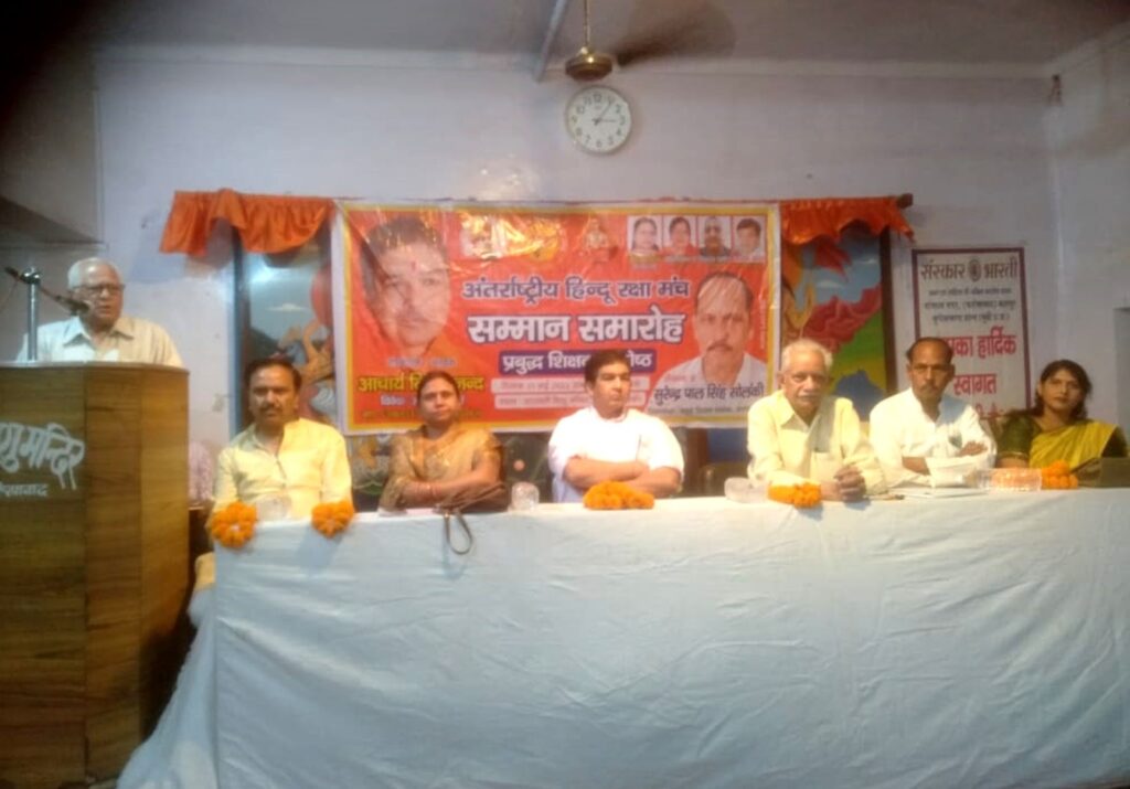 फर्रुखाबाद, समृद्धि न्यूज। अंतर्राष्ट्रीय हिन्दू रक्षा मंच प्रबुद्ध शिक्षक प्रकोष्ठ द्वारा सरस्वती शिशु मंदिर सेनापति में कार्यक्रम का आयोजन हुआ। मुख्य अतिथि राष्ट्रीय कवि डॉ0 शिवओम अंबर ने कहा कि हिन्दू धर्म सभी को अपने में समहित कर लेता है। सनातन धर्म की परम्पराओं और सिद्धान्तों को आत्मसात करने की आवश्यकता है। युवाओं को राष्ट्र एवं हिन्दू धर्म की रक्षा के लिए अपने दायित्वों के प्रति तत्पर एवं जागरुक रहने की आवश्यकता है। उन्होंने कहा कि हमारा भारत वर्ष एक धर्म निरपेक्ष देश है।