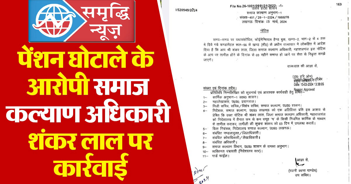 • महाराजगंज का समाज कल्याण अधिकारी शंकर लाल नौकरी से बर्खास्त, करीब 65 लाख रुपए के पेंशन घोटाले में कार्रवाई हुई ,  शंकर लाल से वसूली के आदेश जारी हुए