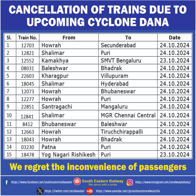 चक्रवाती तूफान दाना की आशंका को देखते हुए दक्षिण पूर्व रेलवे (SER) क्षेत्र से गुजरने वाली 150 से अधिक एक्सप्रेस और पैसेंजर ट्रेनों को रद्द कर दिया गया है। साउथ-ईस्ट रेलवे के अधिकारी ने बताया कि रद्द की गई ट्रेनों में हावड़ा-सिकंदराबाद फलकनुमा एक्सप्रेस, कामाख्या-यशवंतपुर एसी एक्सप्रेस, हावड़ा-पुरी शताब्दी एक्सप्रेस, हावड़ा-भुवनेश्वर शताब्दी एक्सप्रेस और हावड़ा-यशवंतपुर एक्सप्रेस शामिल हैं। SER के अधिकारी ने कहा कि रद्द की गई ट्रेनें 23 से 25 अक्टूबर तक अपने शुरुआती स्टेशनों से प्रस्थान करने वाली थीं। जरूरत पड़ने पर दक्षिण-पूर्व क्षेत्र से गुजरने वाली और भी ट्रेनों को रद्द किया जा सकता है। बता दें कि कोलकाता मुख्यालय वाले SER क्षेत्र में पश्चिम बंगाल, ओडिशा और झारखंड आदि आते हैं।