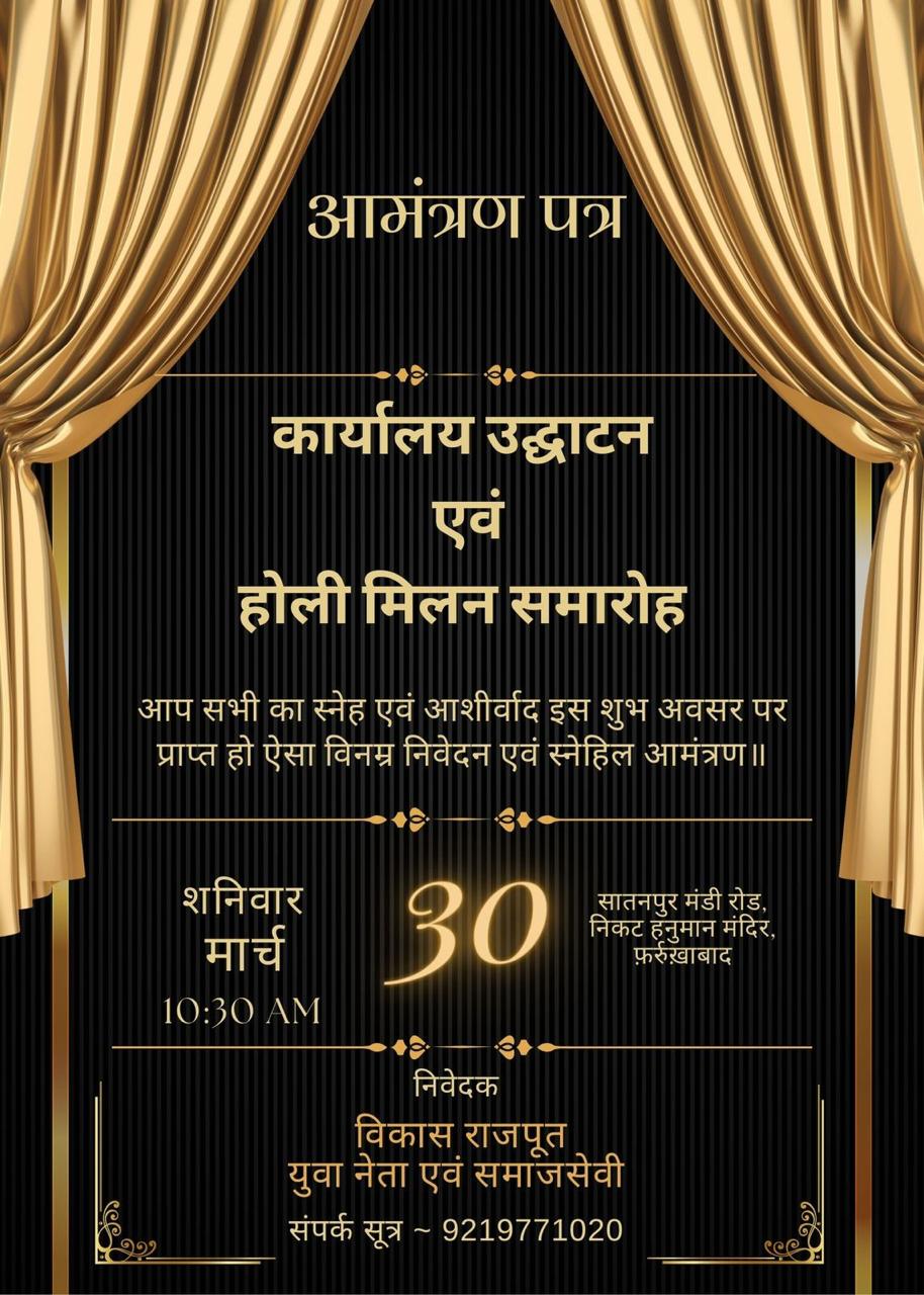 फर्रुखाबाद, समृद्धि न्यूज। कार्यालय उद्घाटन व होली मिलन समारोह 30 मार्च शनिवार को सातनपुर मण्डी रोड निकट हनुमान मंदिर के पास 10:30 बजे होगा। युवा नेता व समाजसेवी विकास राजपूत ने सभी से कार्यक्रम में पहुंचने की अपील की है।