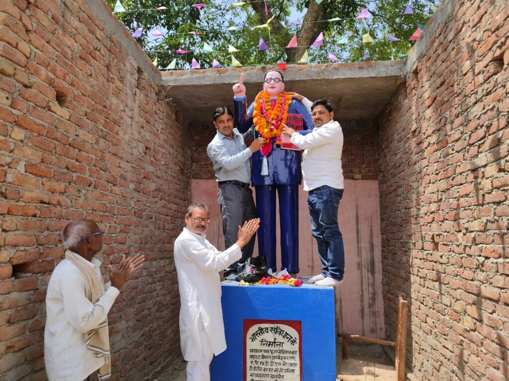 डॉक्टर भीमराव अंबेडकर की मूर्ति पर माल्यार्पण एवं पुष्प अर्पित करते लोग