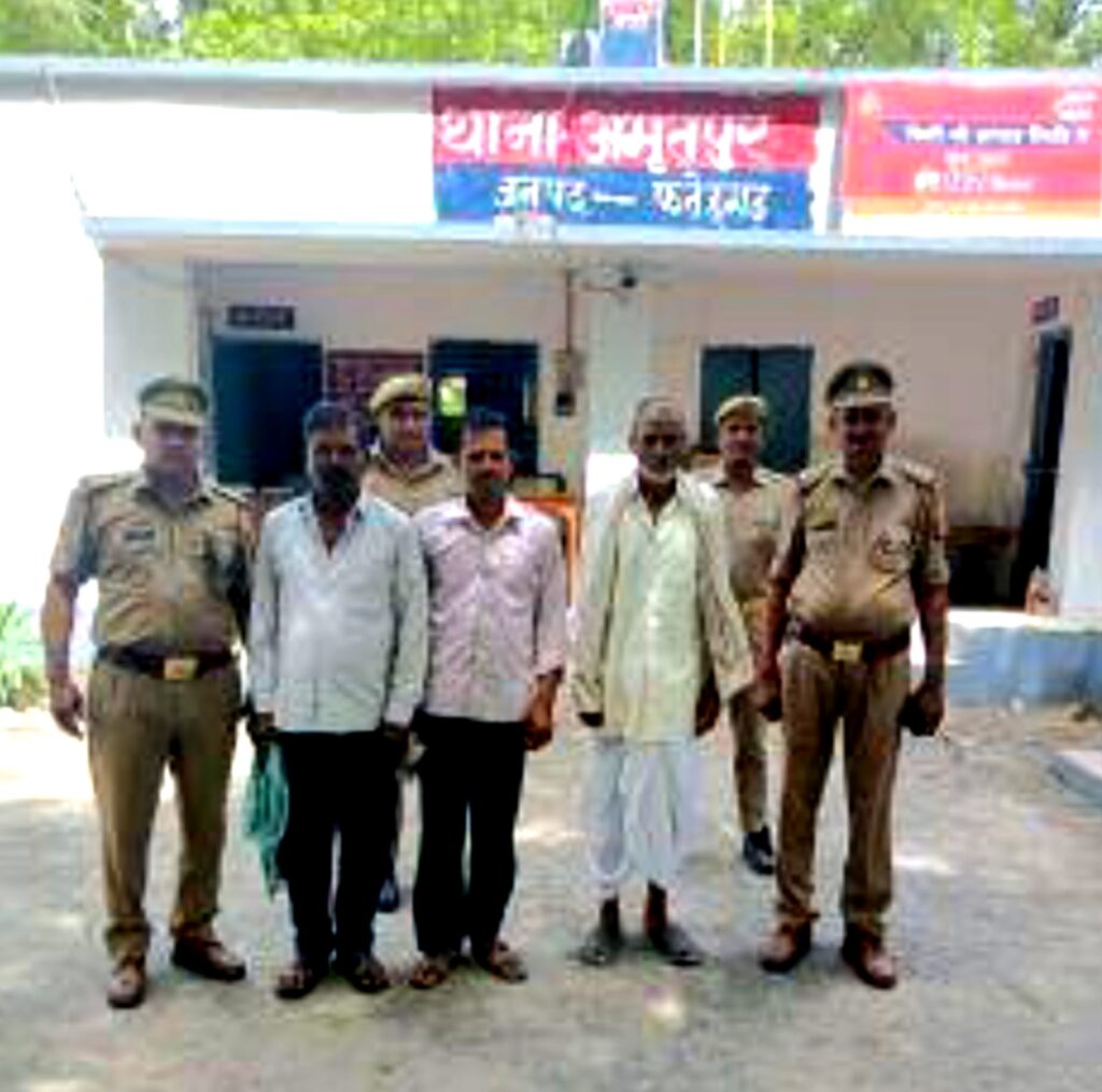 रविवार को थाना प्रभारी संतप्रकाश, उपनिरीक्षक उदयवीर सिंह अपने हमराहों के साथ क्षेत्र में अपराधियों की धरपकड़ हेतु चेकिंग अभियान चला रहे थे, तीन संदिग्धों को बासी अड्डा अमृतपुर से गिरफ्तार कर लिया। पूछताछ के दौरान एक ने अपना नाम रनछोर पुत्र श्रीपाल निवासी उधरनपुर लीलापुर, दूसरे ने अपना नाम उमेश पाल पुत्र श्रीपाल निवासी उधरनपुर लीलापुर, तीसरे ने अपना नाम रामलडै़ते पुत्र सूबेदार पाल निवासी भुडिय़ा कांठ जिला शाहजहांपुर बताया। जांच पड़ताल के दौरान पता चला कि रनछोर व उमेश पाल तथा रामलडै़ते धारा ४२०, ४६७, ४६८, ४७१, १२०बी में वांछित थे। पुलिस ने मुकदमा दर्ज कर जेल भेज दिया।