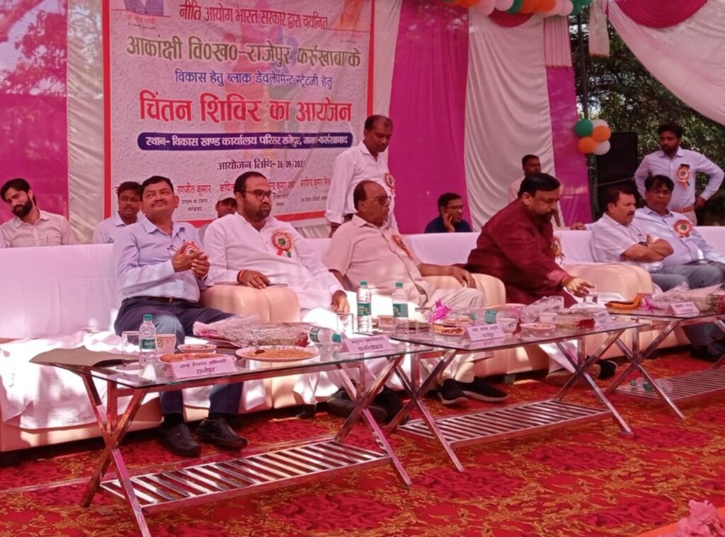 नीति आयोग भारत सरकार द्वारा चिंतन शिविर का आयोजन विकास खंड राजेपुर में मंगलवार को किया गया। कार्यक्रम का शुभारंभ रंजीत कुमार उपायुक्त श्रम रोजगार कंपिल, परियोजना निदेशक योगेंद्र कुमार पाठक, जिला विकास अधिकारी अरविंद कुमार, मुख्य विकास अधिकारी, सांसद मुकेश राजपूत, विधायक अमृतपुर सुशील शाक्य, विकास खंड अधिकारी कौशल कुमार, अजीत पाठक, ब्लॉक प्रमुख पल्लव सोमवंशी ने मां सरस्वती के चित्र पर माल्यार्पण व दीप प्रज्वलित कर किया। मुख्य विकास अधिकारी ने मौजूद ग्रामीणों कृषि कार्य के बारे में विस्तारपूर्वक जानकारी देते हुए बताया किसान अपनी खेती में पेस्टिसाइड एवं रासायनिक उर्वरक का प्रयोग ना करके जैविक उर्वरक का प्रयोग करें। इससे होने वाले हानि लाभ के बारे में विस्तारपूर्वक जानकारी दी। वहीं सांसद मुकेश राजपूत ने पर्यावरण संरक्षण एवं जल संरक्षण के बारे में विस्तृत जानकारी देने के साथ होने वाली हानि लाभ के बारे में बताया।