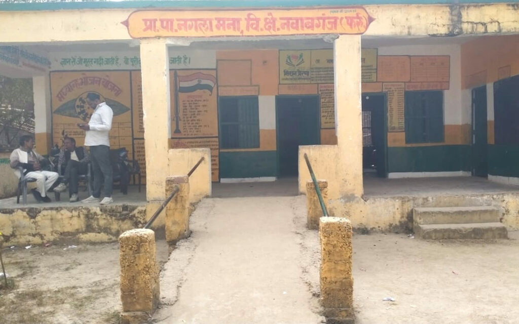 नवाबगंज विकासखंड क्षेत्र के ग्राम पंचायत बिजौरी के प्राथमिक विद्यालय नगला मना में गुरुवार को सरकार के दावों की हकीकत तब खुली जब वहां पहुंचकर देखा गया और बच्चों से जानकारी की गई की विद्यालय में भोजन बना है या नहीं, तो पहले तो बच्चे कोई स्थाई उत्तर नहीं दे सके, लेकिन जब गहनता से जानकारी की गई तो कई बच्चों ने बताया कि उनके पास घर से लाए हुए बर्तन नहीं थे इस वजह से उनको विद्यालय का भोजन नहीं मिला। जब इस बाबत इंचार्ज प्रधानाध्यापक बृजेश कुमार से जानकारी की गई कि आपके विद्यालय में बच्चों के लिए भोजन थाली है या नहीं, तो उन्होंने बताया की विद्यालय में पहले एक ग्रांट आई होगी तो बर्तन आए होंगे, लेकिन अब इस वक्त कोई बर्तन नहीं है जिसमें बच्चों को भोजन दिया जा सके। वहीं जब खंड शिक्षा अधिकारी अमर सिंह राणा से जानकारी की गई तो उन्होंने बताया की विद्यालय में ग्रांट भी आई थी और बर्तन भी खरीदे गए थे, यदि ऐसा हुआ है तो संबंधित अध्यापक के विरुद्ध कार्रवाई की जाएगी। खंड शिक्षा अधिकारी अमर सिंह राणा ने बताया कि अध्यापक से वार्ता कर उनसे स्पष्टीकरण मांगा जाएगा। वहीं विकासखंड द्वारा सरकार के दावों के अनुसार विद्यालयों में 19 पैरामीटर पूरे करने के लिए दो वर्ष से लगातार बैठकें जारी हैं और विद्यालय को अच्छी व्यवस्था में करना सरकार का लक्ष्य है, लेकिन वहां ऐसा कुछ नहीं है। पूरे विद्यालय में मात्र एक कमरे में समतलीकरण किया गया है बाकी विद्यालय की जर्जर व्यवस्था है। टूटी पड़ी फर्स तथा जर्जर पड़े कमरे, फील्ड में तो कई महीनों से झाड़ू ही हीं लगा है।