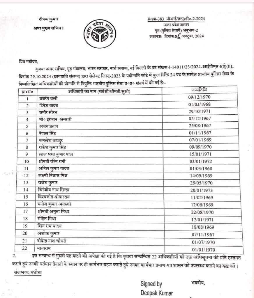 उत्तर प्रदेश के 22 पीपीएस अधिकारियों को बुधवार को आईपीएस में पदोन्नति मिली। राष्ट्रपति से मंजूरी मिलने के बाद गृह मंत्रालय ने पदोन्नति का आदेश जारी किया था। सभी अधिकारियों को उनकी वर्तमान तैनाती स्थलों पर ही पदोन्नत किया गया है। इनमें चिरंजीव नाथ सिन्हा और रश्मि रानी पति-पत्नी भी शामिल हैं।