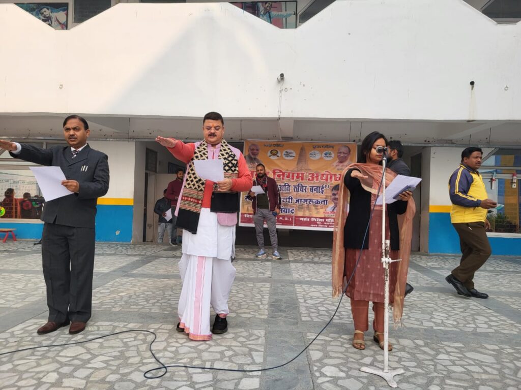 समृद्धि न्यूज़ अयोध्या। शनिवार को महापौर गिरीश पति त्रिपाठी के नेतृत्व मे ‘‘अवधपुरी अति रूचिर बनाई’’ अभियान के तहत टाइनी टाट्स विद्यालय के छात्रों के साथ नगर को स्वच्छ बनाये रखने एवं अच्छे पर्यावरण के दृष्टिगत पॉलीथीन मुक्त किये जाने व कपड़े के थैले का उपयोग किये जाने हेतु जन संवाद कार्यक्रम का आयोजन नगर निगम द्वारा किया गया। उल्लेखनीय है कि अयोध्या को स्वच्छ एवं सुन्दर बनाये जाने व पॉलीथीन मुक्त किये जाने हेतु ‘‘अवधपुरी अति रूचिर बनाई’’ अभियान का शुभारम्भ नगर निगम द्वारा किया गया है।