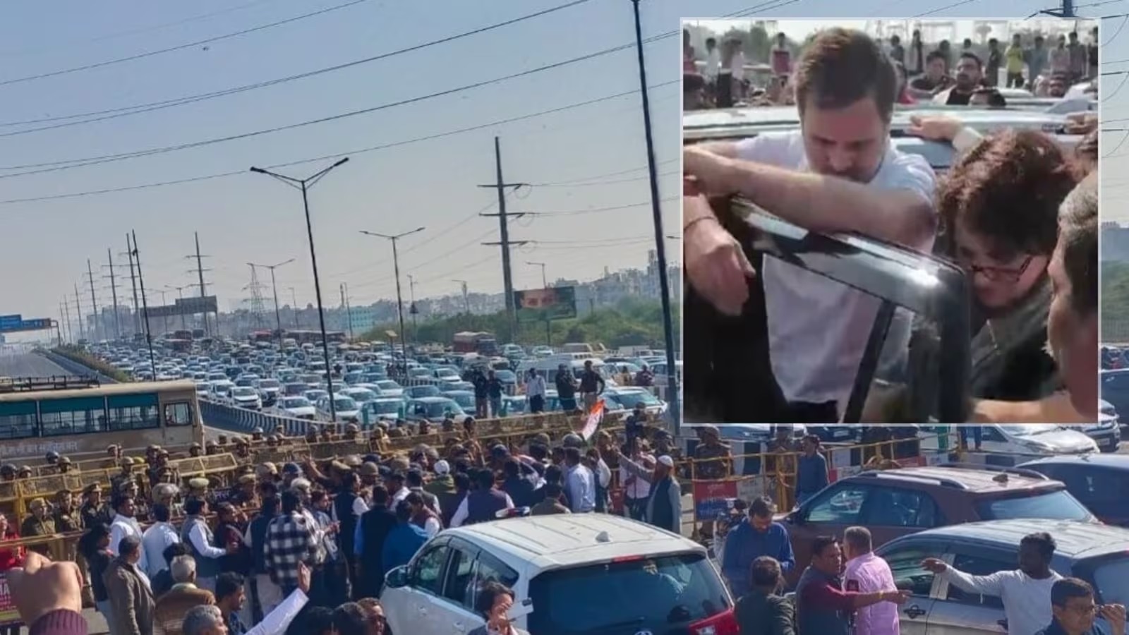 #WATCH | Congress leaders including Lok Sabha LoP and MPs Rahul Gandhi and Priyanka Gandhi Vadra stopped at the Ghazipur border on the Delhi-Meerut Expressway.