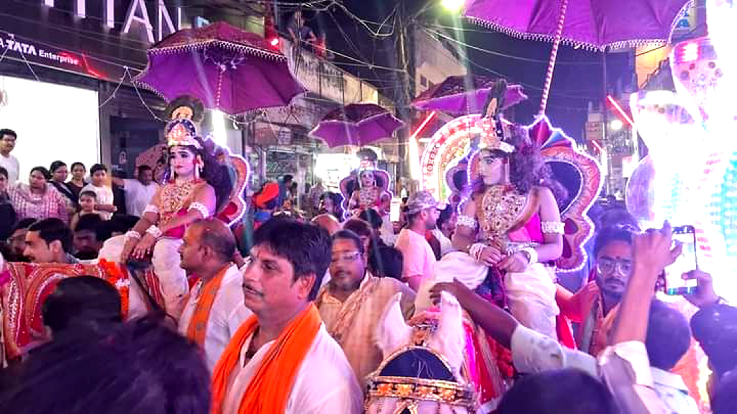 फर्रुखाबाद, समृद्धि न्यूज। आदर्श रामलीला मण्डल फर्रुखाबाद द्वारा श्रीराम बारात शोभायात्रा धूमधाम से नगर में निकाली गई। श्रीराम बारात में लोगों ने जयकारे लगाये और जगह-जगह भगवान श्रीराम का स्वागत हुआ और आरती उतारी गयी। भारतीय पाठशाला इंटर कालेज से शुरु होकर श्रीराम बारात लोहाई रोड, चौक, नेहरु रोड, घुमना, नितगंजा होते हुए रेलवे रोड से वापस भारतीय पाठशाला इंटर कालेज पहुंची। अध्यक्ष व मंंत्री ने भगवान श्रीराम की आरती उतारी। राम बारात में विभिन्न रथ व झांकियां एवं डीजे निकले। साथ ही लोग थिरकते हुए नाचते-गाते हुए चल रहे थे। राम बारात में शामिल रथ गणेश जी, काली का अखाड़ा, शंकर जी, नंदी शंकर, कार्तिकेय जी, वैभव लक्ष्मी जी, सूर्यदेव, अशोक वाटिका, चन्द्रदेव, बालकृष्ण, राणी सती, परशुराम, भैरो, राधा-कृष्ण, हनुमान, वामन अवतार, महाकाल शंकर, विश्वमोहिनी, महर्षि बाल्मीकि जी, दुर्गा जी, लड्डू गोपाल, बि_न स्वामी, बाहुबली हनुमान जी, राम जन्म, त्रिकाली २९ मुखी, यमराज जी, काली अखाड़ा, काली जी, विश्वामित्र वशिष्ठ, दशरथ, रामजी, लक्ष्मण, भरत, शत्रुघ्न जी, गुलाब बाड़, ढोल, नगाड़े, बैण्ड बाजा आदि थे। इस मौके पर प्रबल त्रिपाठी, रामनिवास गुप्ता, सूर्यप्रकाश भारद्वाज, शिवांग रस्तोगी, सुधेश दुबे, सुरेन्द्र पाण्डेय, पंकज वर्मा सहित बड़ी संख्या में लोगों ने सहयोग किया।