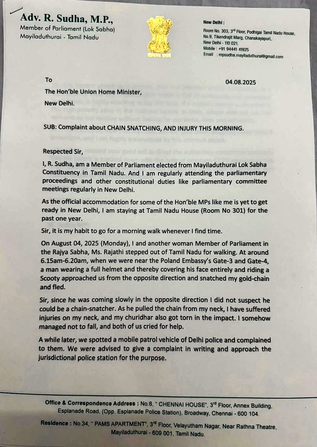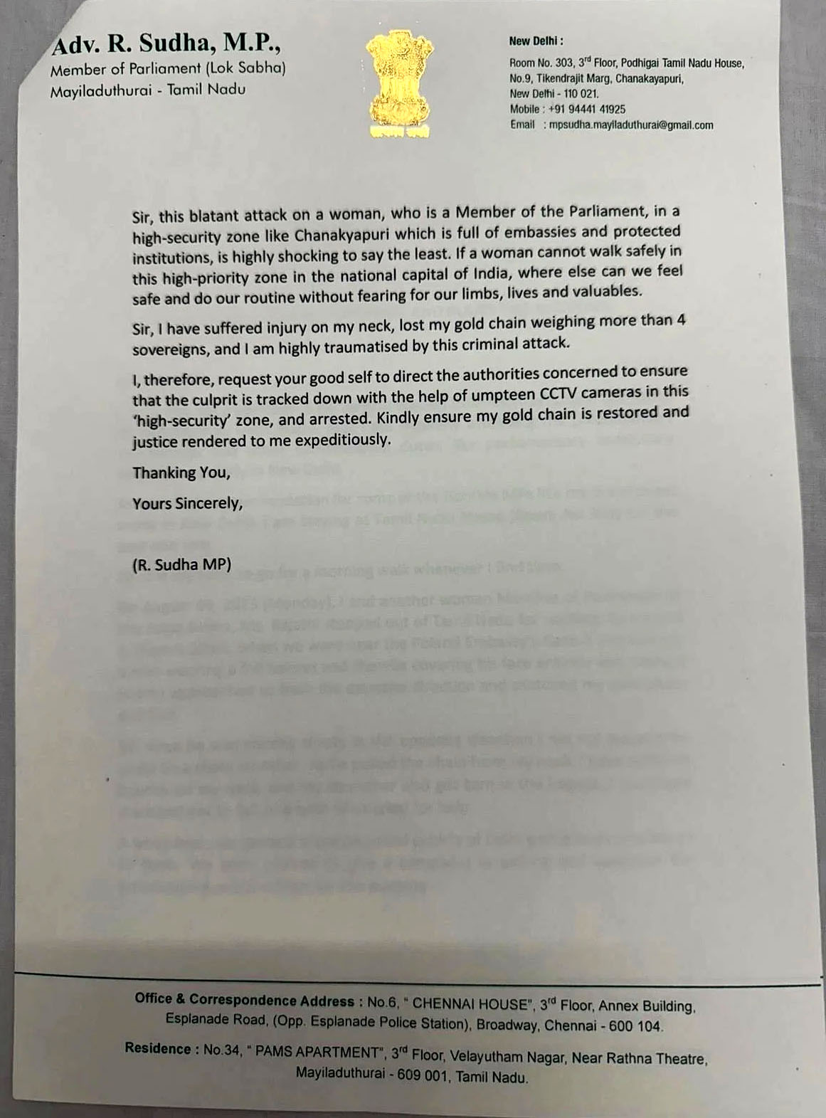 केंद्रीय गृह मंत्री अमित शाह को लिखे एक पत्र में, सुश्री सुधा ने पर्याप्त सुरक्षा व्यवस्था के अभाव पर खेद व्यक्त किया। जिसके परिणामस्वरूप उच्च सुरक्षा वाले क्षेत्र में भी एक सांसद पर हमला हुआ। सुधा ने कहा कि उन पर हुए हमले से वह आहत हैं। सुबह लगभग 6.15-6ण्20 बजे, जब हम पोलैंड दूतावास के गेट-3 और गेट-4 के पास थे, एक आदमी जिसने पूरा हेलमेट पहना हुआ था और जिससे उसका चेहरा पूरी तरह ढका हुआ था। स्कूटी चला रहा था और विपरीत दिशा से हमारे पास आया और मेरी सोने की चेन छीनकर भाग गया।
