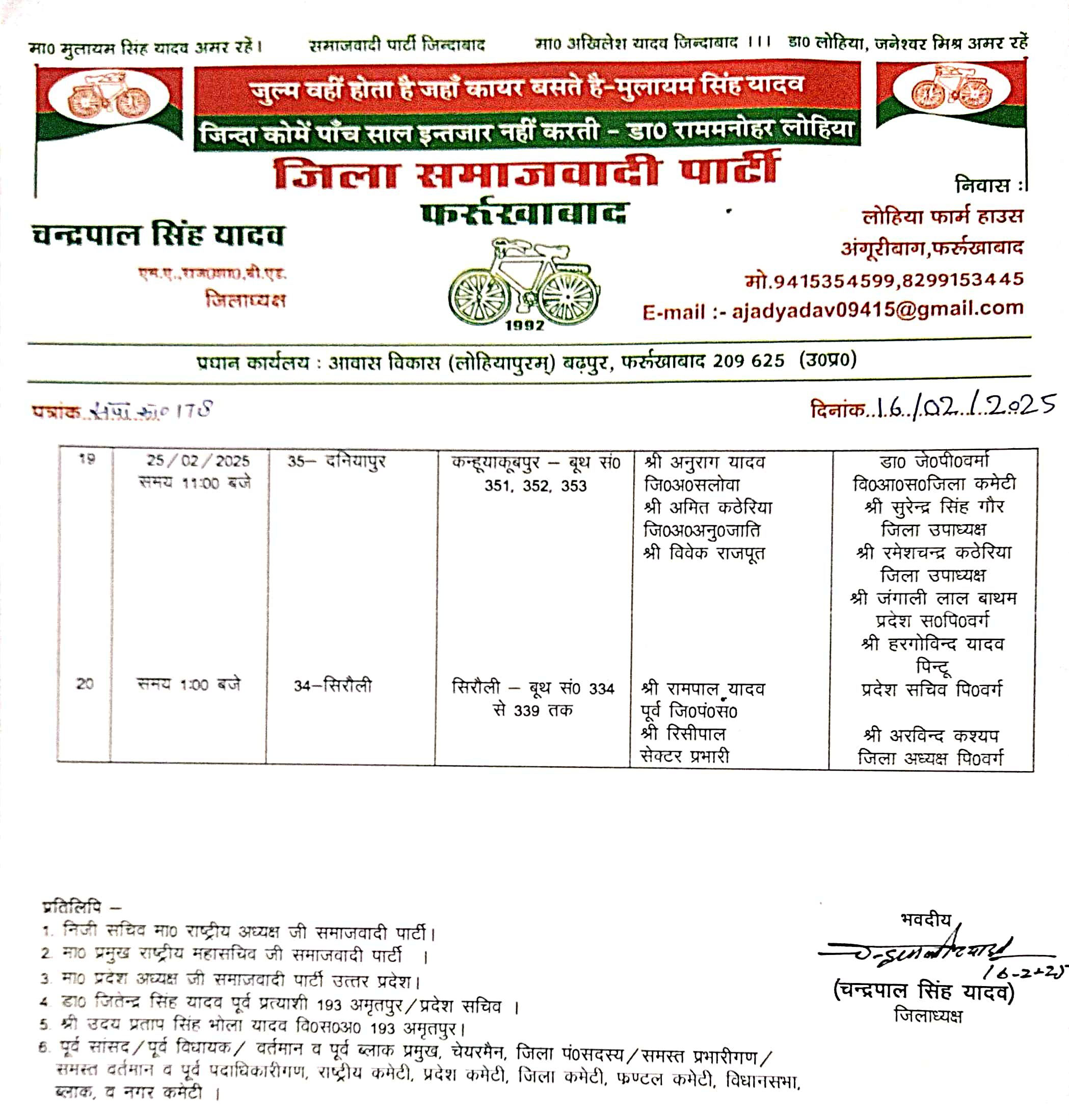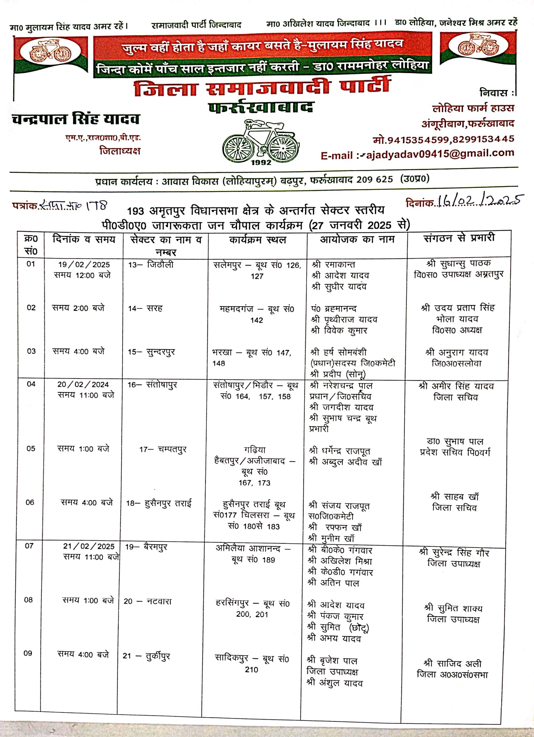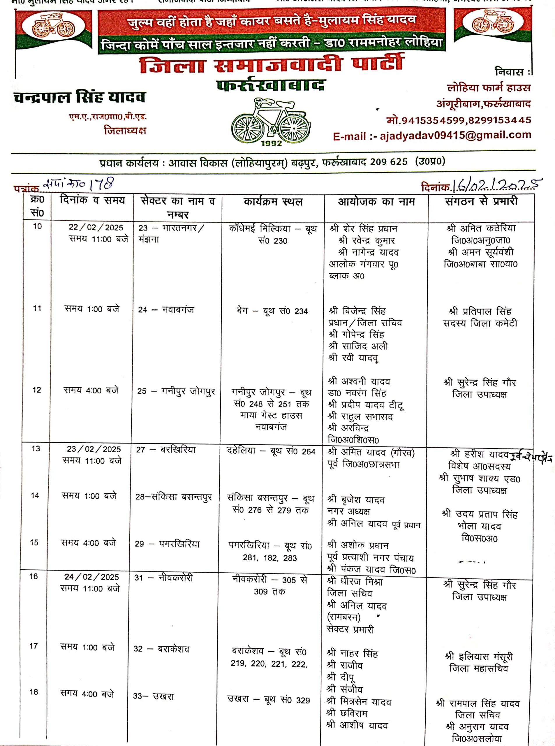 सेक्टर 28 संकिसा बसंतपुर कार्यक्रम स्थल संकिसा बसंतपुर बूथ संख्या 276 से 279 तक, आयोजक बृजेश यादव नगर अध्यक्ष, अनिल यादव पूर्व प्रधान व प्रभारी उदय प्रताप सिंह भोला यादव (वि0स0अ0) होंगे। सेक्टर 29 पमरखिरिया कार्यक्रम पमरखिरिया बूथ संख्या 281, 182, 283, आयोजक प्रधान अशोक पूर्व प्रत्याशी नगर पंचायत, पंकज यादव जि0स0 व प्रभारी उदय प्रताप सिंह भोला यादव (वि0स0अ0) होंगे। 24 फरवरी को सेक्टर 31 नीव करोरी, कार्यक्रम स्थल नीवकरोरी बूथ संख्या 305 से 309 तक आयोजक धीरज मिश्रा जिला सचिव, अनिल यादव (रामवरन) सेक्टर प्रभारी व प्रभारी सुरेन्द्र सिंह गौर जिला उपाध्यक्ष होंगे। सेक्टर 32 बराकेशव कार्यक्रम स्थल बराकेशव बूथ संख्या 219, 220, 221, 222 आयोजक नहार सिंह, राजीव, दीपू, संजीव व प्रभारी इलियास मंसूरी जिला महासचिव होंगे। सेक्टर 33 पुखरा बूथ संख्या 329 आयोजक मित्रसेन यादव, छविराम, आशीष यादव व प्रभारी रामपाल सिंह यादव जिला सचिव, अनुराग यादव जि0अ0सलोवा होगें। 25 फरवरी को सेक्टर 36 दनियापुर कार्यक्रम स्थल कन्हूयाकूबपुर बूथ संख्या 351, 352, 353, आयोजक अनुराग यादव जि0अ0सलोवा, अमित कठेरिया जि0अ0अनु0जाति, विवेक राजपूत व प्रभारी डा0 जेपी वर्मा वि0आ0स0जिला कमेटी, सुरेन्द्र सिंह गौर जिला उपाध्यक्ष, रमेश चन्द्र कठेरिया जिला उपाध्यक्ष, जंगाली लाल बाथम प्रदेश स0पि0 वर्ग, हरगोविन्द यादव पिन्टू प्रदेश सचिव पिछड़ा वर्ग होंगे। सेक्टर 34 सिरौली कार्यक्रम स्थल सिरौली बूथ संख्या 334 से 339 तक आयोजक रामपाल यादव पूर्व जिला पंचायत सदस्य, रिसीपाल सेक्टर प्रभारी व प्रभारी अरविन्द कश्यप जिला अध्यक्ष पिछड़ा वर्ग होंगे।