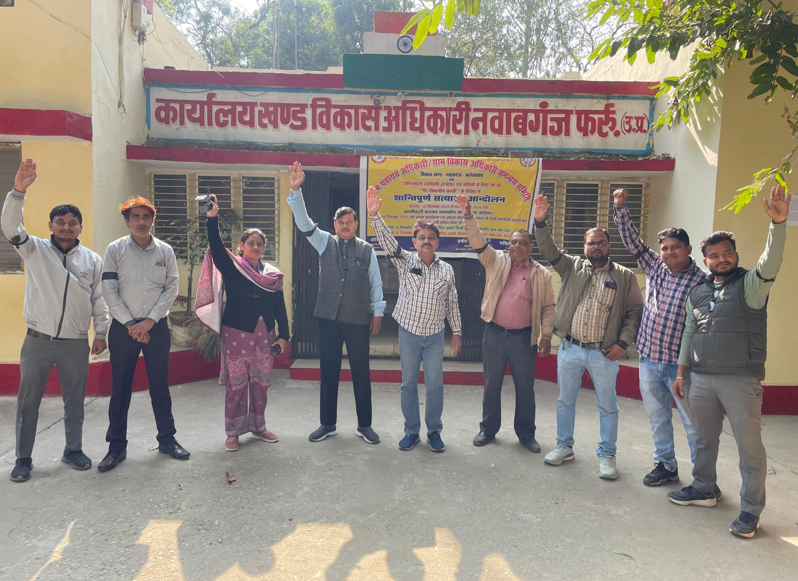 नवाबगंज विकास खंड कार्यालय पर केंद्रीय नेतृत्व के आह्वान पर ग्राम पंचायत अधिकारियों एवं ग्राम विकास अधिकारियों ने विकास खंड कार्यालय पर काली पट्टी बांधकर विरोध जताया। जिसमें उन्होंने बताया कि काम का बोझ और ऑनलाइन हाजिरी का वह विरोध कर रहे है। उन्होंने बताया कि यह आंदोलन १५ दिसंबर तक चरणबद्ध तरीके से किया जायेगा। जिसके लिए आज से इसकी शुरुआत हो चुकी है। यह आंदोलन उनके मूल विभाग के कार्यों के अतिरिक्त अन्य विभागों के कार्यों के अत्यधिक बोझ और फेशियल रिकॉर्ड कनेक्शन बेस्ड अटेंडेंस सिस्टम के विरोध में किया जा रहा है। सचिवों का कहना है कि गैर कार्यों के चलते वह अपना कार्य समुचित रुप से नहीं कर पा रहे है। ग्राम पंचायत सचिवों ने कहा कि फार्मर रजिस्ट्री, एग्रो स्टेट सर्वे, गौशाला प्रबंधन, भूसा प्रबंधन, आयुष्मान हेल्थ कार्ड, फैमिली आईडी, विभिन्न पेंशनों का सत्यापन, शिक्षा विभाग के ऑपरेशन कायाकल्प एवं बोर्ड परीक्षा में ड्यूटी सोलर पैनल लगवाने का लक्ष्य और परली प्रबंधन संघ का कार्य, आदि के चलते कर्मचारी अस्वस्थ्य हो रहे हैं और दुर्घटनाओं का शिकार भी बना रहे हैं। 1 से 4 दिसंबर तक प्रदेश के समस्त विकास खण्डों में सचिव काली पट्टी बांधकर सांकेतिक विरोध प्रदर्शन करेंगे तथा विकास खंड कार्यालय पर शांतिपूर्ण ढंग से नारेबाजी करेंगे। 5 दिसंबर से सभी 826 विकास खण्डों में एक दिवसीय सत्याग्रह आंदोलन होगा। इस दिन में मुख्यमंत्री को समस्याओं से संबंधित ज्ञापन प्रेषित करेंगे। इसके बाद सभी सचिव शासकीय व्हाट्सएप ग्रुपों से खुद को अलग कर लेंगे। 10 दिसंबर से प्रदेश के सभी सचिव निजी वाहनों से सरकारी कार्य करना बंद कर देंगे।15 दिसंबर को समस्त सचिव अपने डोंगल विकास खण्डों पर एडियो पंचायत को समर्पित कर देंगे। संघ ने चेतावनी दी है कि यदि शासन द्वारा सकारात्मक प्रयास नहीं किए गए तो प्रदेश के सचिव संपूर्ण कार्य बहिष्कार एवं अनवरत धरना प्रदर्शन के लिए मजबूर होंगे। इसकी पूरी जिम्मेदारी शासन प्रशासन की होगी। सोमवार को आंदोलन के पहले दिन सचिवों ने सुबह 10:00 बजे से 11:00 तक विकासखंड प्रसार में काली पट्टी बांधकर प्रतीकात्मक विरोध दर्ज कराया। इस मौके पर ग्राम पंचायत संगठन के जिला सचिव प्रमोद शुक्ला, अनुपम बाजपेई, ब्लॉक अध्यक्ष बृजेश कुमार यादव, मोतीलाल यादव, आकांक्षा सक्सेना, प्रवीण कुमार, वेद प्रकाश, कामता प्रसाद पटेल, कुलदीप राजपूत, अरविंद कुमार, सुनील कुमार गौतम साहित समस्त ग्राम सचिव व ग्राम पंचायत अधिकारी मौजूद रहे।