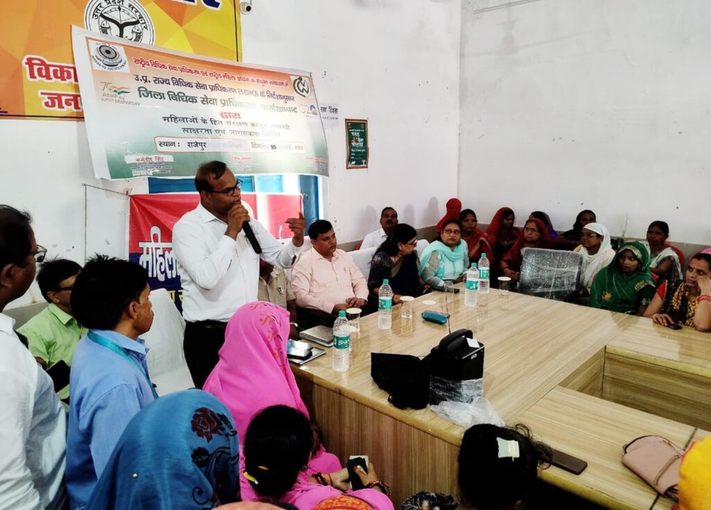 ब्लाक राजेपुर में अपर जिला जज अस्वनी कुमार की अध्यक्षता में महिलाओं के हित संरक्षण कानून विषय पर विधिक जागरूकता शिविर का आयोजन किया गया। जिसमें महिलाओं को उनके अधिकारों को जानने के लिए प्रेरित किया गया। अपर जिला जज अश्विनी कुमार ने महिलाओं से कहा आज के समय में महिलाओं व पुरुषों में बराबरी की हिस्सेदारी है। सभी महिलाओं को अपने मौलिक अधिकार जानने की आवश्यकता है। तहसीलदार अमृतपुर कर्मवीर सिंह ने महिलाओं को संबोधित करते हुए कहा कि सरकार मिशन शक्ति के तहत नारी सुरक्षा, नारी सम्मान, नारी स्वावलंबन बनाने के लिए महिलाओं को प्रेरित कर रही है। आज हर विभाग में महिलाओं की बराबरी की हिस्सेदारी पाई जा रही है। इस कार्यक्रम में राजेपुर ब्लाक की महिलाओं ने बढ़-चढक़र हिस्सा लिया। कुर्सियां ना होने की वजह से महिलाओं को जमीन पर बैठना पड़ा। अपर जिला जज ने ब्लॉक में घुसते ही विकास खंड अधिकारी कौशल किशोर गुप्ता को जमकर लताड़ लगायी। अवस्थाएं देख अपर जिला जज का पारा चढ़ गया। अपर जिला जज के आने से पहले विकास खंड अधिकारी कौशल किशोर गुप्ता के कमरे में एपीओ राशिद अली व बड़े बाबू सुरेंद्र पाल के बीच जमकर गाली गलौज हुआ व एक दूसरे को देख लेने तक की धमकी दी। भीड़ को जमीन पर बैठा देख राजेपुर थाने की एक महिला दरोगा इला सिंह नेे अपनी महिला सहायक पुलिस कर्मी पूजा सिंह व कंचन प्रभा को बुलाया और दरोगा इला सिंह जमीन पर बैठी महिलाओं को पेड़ के नीचे खड़ा कर नारी शक्ति के संबंध में जानकारियां देने लगीं। उन्होंने सभी महिलाओं को अपने अधिकार जानने के लिए अपील की। विकास खंड अधिकारी कौशल किशोर गुप्ता की घोर लापरवाही के चलते महिलाएं शिविर में पानी तक को तरसती नजर आयीं।