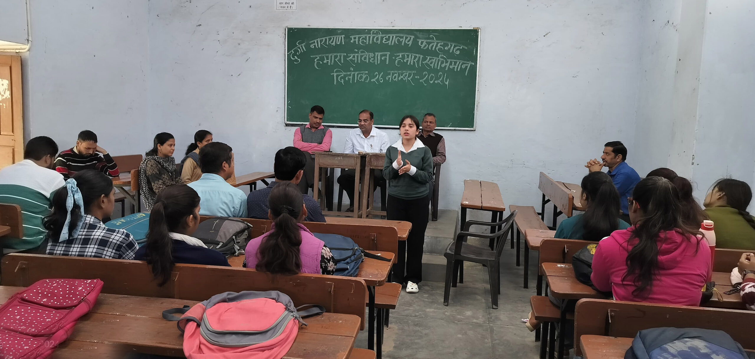 फर्रुखाबाद, समृद्धि न्यूज। दुर्गा नारायण महाविद्यालय फतेहगढ़ में राष्ट्रीय सेवा योजना के समन्वयक डा0 श्याम मिश्रा के निर्देशन में महाविद्यालय के प्राचार्य की अध्यक्षता में संविधान दिवस पर संगोष्ठी का आयोजन हुआ। छात्र-छात्राओं ने बढ़-चढक़र प्रतिभाग किया। राजनीति विज्ञान के विभागाध्यक्ष डा0 आलोक कुमार सिंह ने भारतीय संविधान की विशेषताओं एवं संविधान दिवस के महत्व पर प्रकाश डाला। प्राचार्य डा0 मनोज गर्ग ने संविधान में प्रदत्त मौलिक अधिकार एवं कर्तव्यों पर प्रकाश डालते हुए शपथ दिलायी। संचालन डा0 एचएसएन गुप्ता ने किया। इस अवसर पर शिक्षक डा0 अजहर जुनैद आलम, डा0 पंचम सिंह, विनय कुमार बाथम, प्रियांशु सिन्हा, अनामिका मिश्रा, शीतल त्रिवेदी व शिक्षणेत्तर कर्मचारी मौजूद रहे। साथ ही विश्वविद्यालय के निर्देशानुसार राष्ट्रीय तम्बाकू नियंत्रण कार्यक्रम के अन्तर्गत तम्बाकू मुक्त युवा अभियान कार्यक्रम विद्यालय में प्राचार्य की अध्यक्षता में सम्पन्न हुआ और उन्होंने तम्बाकू की हानियों पर प्रकाश डाला।