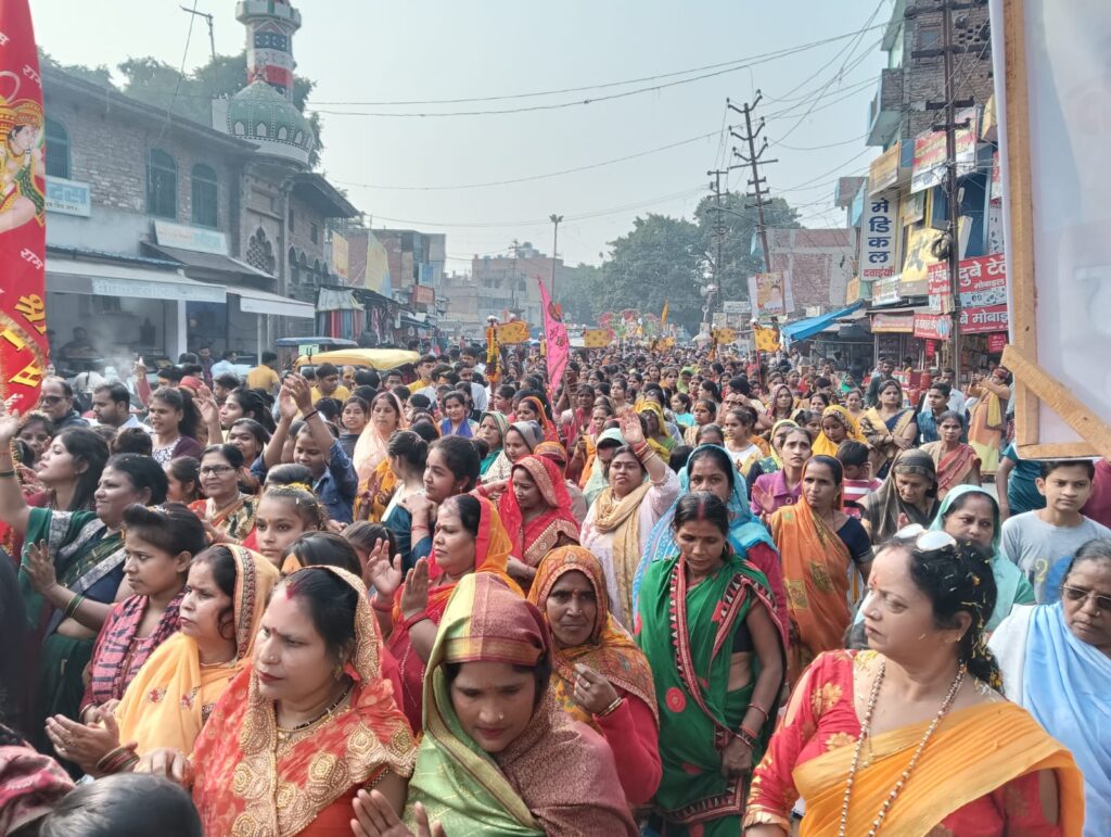 फर्रुखाबाद, समृद्धि न्यूज। 13वां श्री श्याम शरद महोत्सव की निशान यात्रा लोहाई रोड स्थित श्याम मंदिर से शुरु होकर शहर के मुख्य मार्गो पर धूमधाम से निकाली गई। श्याम कृपा मण्डल के सदस्यों द्वारा पद यात्रा में श्याम बाबा के गीतों पर डीजे की धुन पर नाचते-गाते भक्तगण शोभायात्रा में शामिल हुए। निशान यात्रा में बड़ी संख्या में भक्तों के साथ महिलायें व बच्चों ने भाग लिया। हाथों में निशान लिये महिलायें मुख्य मार्ग पर नाचते-गाते हुए शोभायात्रा में शामिल हुई। सुरक्षा की दृष्टि से पुलिस तैनात रही। चौक, घुमना, लालगेट होते हुए स्वराज कुटीर में शोभायात्रा का समापन हुआ। यात्रा की व्यवस्था श्याम कृपा मण्डल ने देखी। इस मौके पर बड़ी संख्या में भक्तगण मौजूद रहे। नेहरु रोड पर उद्योग व्यापार मण्डल के प्रदेश कार्यसमिति के सदस्य संजय गर्ग ने अपने प्रतिष्ठान के बाहर श्याम शरद यात्रा की आरती उतारी और पुष्प वर्षा कर भव्य स्वागत किया। इस मौके पर मुकेश दुबे, जयनारायन श्याम जी, ऐलान सिंह मौजूद रहे।
