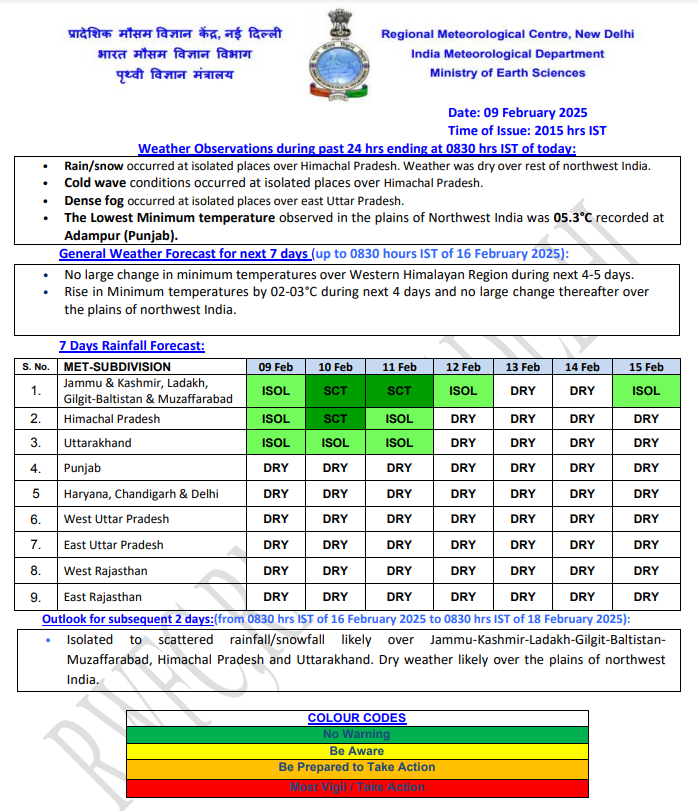 मौसम विभाग ने यह भी बताया कि उत्तरी अफगानिस्तान के निचले और मध्य क्षोभमंडल स्तर पर चक्रवाती परिसंचरण के रूप में पश्चिमी विक्षोभ सक्रिय हुआ है। इसके प्रभाव से हिमाचल प्रदेश के आठ जिलों में सोमवार और मंगलवार को बारिश और बर्फबारी के आसार हैं। पश्चिमी विक्षोभ की सक्रियता से मध्य और उच्च पर्वतीय जिलों किन्नौर, लाहौल-स्पीति, शिमला, सोलन, सिरमौर, मंडी, कुल्लू और चंबा के कई क्षेत्रों में मौसम बदलने का पूर्वानुमान है। न्यूनतम पारा गिरने से इन क्षेत्रों में ठंडक बढ़ने के आसार हैं। सोमवार और मंगलवार को मध्य और उच्च पर्वतीय जिलों के अधिकतम तापमान में तीन से चार डिग्री की कमी आने की संभावना है। मैदानी जिलों में पारा चढ़ने के आसार हैं। केलांग में माइनस 5.5, ताबो में माइनस 5.3, कुकुमसेरी में माइनस 3.9 समेत कुछ अन्य स्थानों पर रात का पारा शून्य से नीचे दर्ज किया गया।