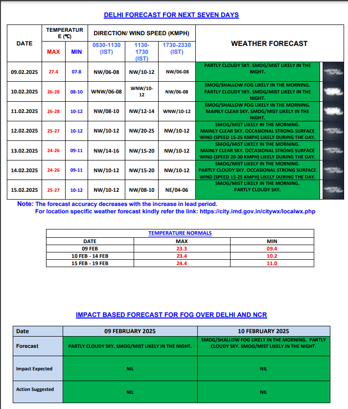 विभाग के मुताबिक, दिल्ली में सोमवार सुबह के समय और रात के वक्त धुंध/हल्का कोहरा छाने की संभावना है. साथ ही कुछ इलाकों में दिन के वक्त बादल छाए रहेंगे. मौसम विभाग के जारी किए गए डाटा के अनुसार, दिल्ली में अधिकतम तापमान 27.4 डिग्री सेल्सियस दर्ज किया गया जो इस मौसम के औसत तापमान से चार डिग्री अधिक है और इस साल में अब तक का सबसे अधिक तापमान भी रहा. इससे पहले 31 जनवरी को सबसे अधिक 27 डिग्री सेल्सियस तापमान दर्ज किया गया था. दिल्ली में 9 फरवरी को अधिकतम तापमान 27.4 डिग्री सेल्सियस और न्यूनतम तापमान 7.8 डिग्री सेल्सियस था.