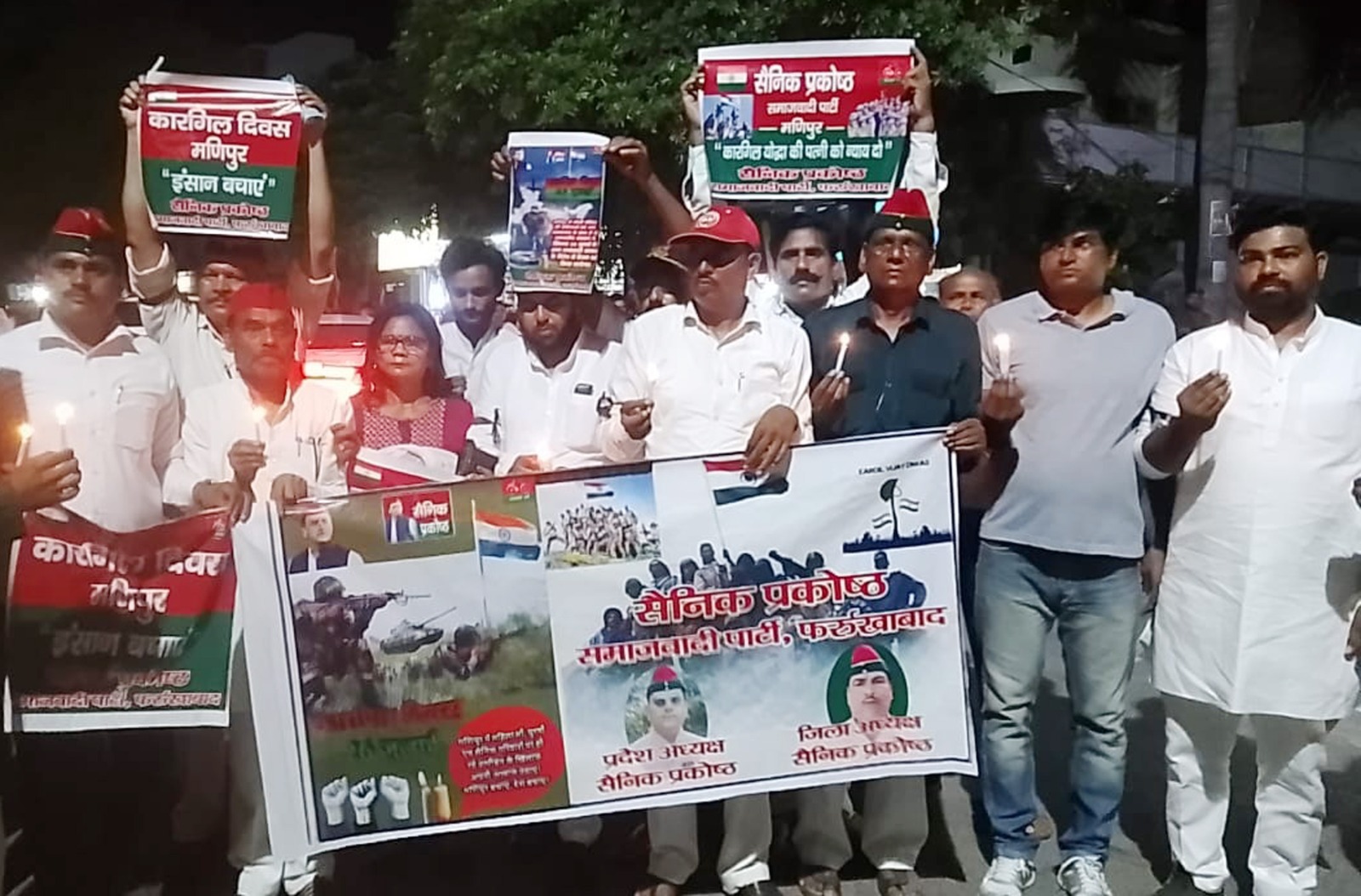 फर्रुखाबाद, समृद्ध न्यूज। प्रदेश नेतृत्व के आह्वान पर कारगिल विजय दिवस एवं मणिपुर में महिलाओं के साथ हो रहे अत्याचार के खिलाफ समाजवादी सैनिक प्रकोष्ठ के नेतृत्व में हाथों में काली पट्टी बांधकर और कैंडिल मार्च सपा कार्यालय से डॉ0 राम मनोहर लोहिया मूर्ति तक निकाला गया और अंत में डॉ0 राम मनोहर लोहिया जी की मूर्ति पर समापन हुआ। इस मौके पर राष्ट्रीय प्रवक्ता डांॅ0 अरविंद गुप्ता ने बताया मणिपुर में महिलाओं के साथ जो दरिंदगी हुई है उसकी हम लोग घोर निंदा करते हैं। इस मौके पर सैनिक प्रकोष्ठ के जिला अध्यक्ष के0के0 यादव ने कहा हम लोग उन शहीदों को नमन कर रहे हैं जिन लोगों ने कारगिल युद्ध में अपनी जान निछावर कर दी और हमारे देश को जीत हासिल कराई थी। इस मौके पर पूर्व जिला अध्यक्ष सैनिक प्रकोष्ठ बेचेलाल यादव ने कहा जनपद के 2 सैनिक जो कारगिल युद्ध में शहीद हो गए थे हम लोगों ने उनके घर जाकर उनके चित्र पर पुष्प अर्पित किए और उनकी धर्म पत्नियों को शाल ओढ़ाकर सम्मानित किया। इस मौके पर समाजवादी सैनिक प्रकोष्ठ के सर्वेश कुमार, अमित कुमार, रघुवीर सिंह, सत्येंद्र सिंह, मनोहर लाल, बृजेश यादव, हरमोहन सिंह, अशोक कुमार, सर्वेश यादव, सुशील कुमार, एमपी सिंह, छोटे सिंह सहित कई सैनिक उपस्थित रहे।