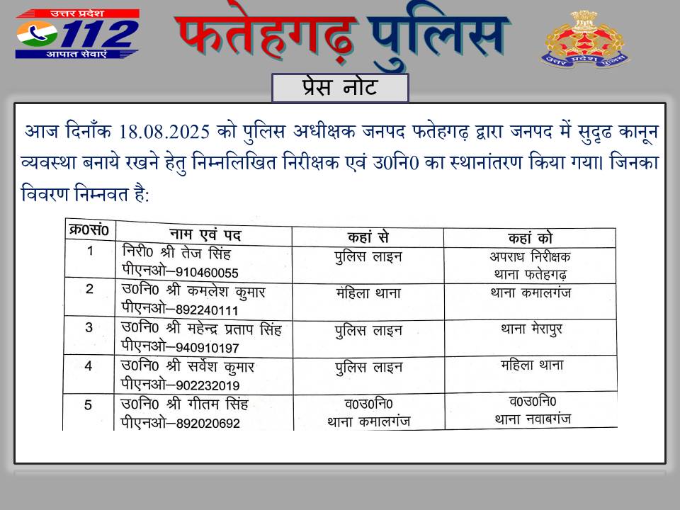 पुलिस अधीक्षक आरती सिंह ने थाना फतेहगढ़ के अपराध निरीक्षक सुदेश कुमार को प्रभारी निरीक्षक राजेपुर का चार्ज दिया है। वहीं निरीक्षक पुलिस लाइन तेज सिंह को अपराध निरीक्षक थाना फतेहगढ़, उपनिरीक्षक कमलेश कुमार महिला थाना से थाना कमालगंज, उपनिरीक्षक महेन्द्र प्रताप सिंह पुलिस लाइन से थाना मेरापुर, उपनिरीक्षक सर्वेश कुमार पुलिस लाइन से महिला थाना, उपनिरीक्षक गीतम सिंह व0उ0नि0 थाना कमालगंज से व0उ0नि0 थाना नवाबगंज भेजा गया है।