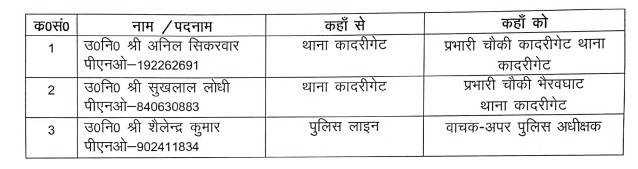 थाना कादरीगेट के उप निरीक्षक सुखलाल लोधी की प्रभारी चौकी भैरवघाट पर नियुक्ति की है,