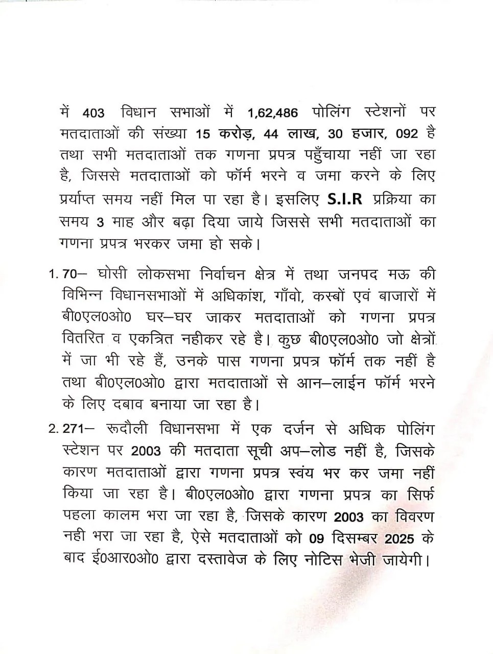 समृद्धि न्यूज। समाजवादी पार्टी ने उत्तर प्रदेश के मुख्य निर्वाचन अधिकारी को पत्र लिखकर उत्तर प्रदेश में मतदाता सूची के लिए जारी विशेष गहन पुनरीक्षण एसआईआर को तीन महीने बढ़ाने की मांग की है। समाजवादी पार्टी ने चुनाव आयोग को चि_ी लिखकर कहा है कि पार्टी के राष्ट्रीय अध्यक्ष अखिलेश यादव ने एसआईआर प्रक्रिया को 3 महीने और बढ़ाने की मांग की है। घोसी लोक सभा निर्वाचन क्षेत्र में तथा जनपद मऊ की विभिन्न विधान सभाओं में बीएलओ द्वारा घर-घर जाकर मतदाताओं को गणना प्रपत्र वितरित एवं एकत्रित करना सुनिश्चित कराया जाये, रूदौली विधान सभा में एक दर्ज से अधिक पोलिंग स्टेशनों पर 2003 की मतदाता की सूची अपलोड करने व लखनऊ की पूर्वी विधानसभा के पोलिंग स्टेशन संख्या 130 व 131 पर 2003 की मतदाता सूची अपलोड करने और लापता 1100 मतदाताओं को तलाश कर पोलिंग स्टेशन पर उपलब्ध कराया जाये।