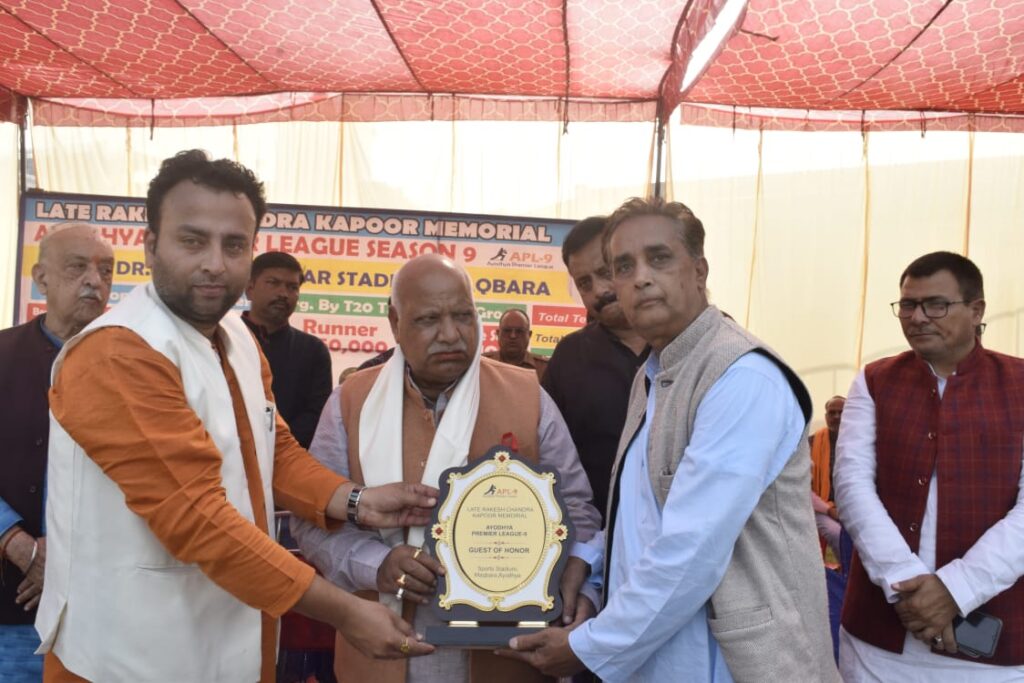समृद्धि न्यूज़ अयोध्या। डा. भीमराव अम्बेडकर स्पोर्टस स्टेडियम मकबरा में शुक्रवार को स्व. राकेश चन्द्र कपूर उर्फ ‘पल्लू भइया’ मेमोरियल अयोध्या प्रीमियर लीग-9 का रंगारंग उद्घाटन हो गया।उद्घाटन कार्यक्रम में मुख्य अतिथि के रूप में सांसद लल्लू सिंह और विशिष्ट अतिथि के रूप में केनरा बैंक के एजीएम विकास भारतीय रहे।अतिथियों का स्वागत के.टी. पब्लिक स्कूल के बच्चों द्वारा बैंड के माध्यम से किया गया।उद्घाटन समारोह में पहुंचे अतिथियों ने स्व. राकेश चन्द्र कपूर के चित्र पर माल्यार्पण कर पुष्पांजलि अर्पित की।कार्यक्रम में मुख्य अतिथि सांसद श्री सिंह का स्वागत आयोजन सचिव सुप्रीत कपूर व निदेशक सैय्यद सुबहानी ने माला व अंगवस्त्र पहनाकर और स्मृति चिन्ह भेटकर किया।कार्यक्रम में विशिष्ट अतिथि के रूप में आये केनरा बैंक के एजीएम श्री भारतीय का स्वागत आयोजन उपाध्यक्ष दीपेन्द्र श्रीवास्तव व युवा भाजपा नेता देवेन्द्र मिश्रा दीपू ने माला व अंगवस्त्र पहनाकर और स्मृति चिन्ह भेटकर किया। कार्यक्रम में आये अन्य अतिथियों के रूप में पूर्व नगर पालिका अध्यक्ष विजय गुप्ता का स्वागत गगन जायसवाल ने,पूर्व जिला पंचायत सदस्य गिरीश पाण्डेय डिप्पुल का स्वागत उमाशंकर जायसवाल ने,व्यापार मण्डल अध्यक्ष सुशील जायसवाल का स्वागत विवेक साहू ने,केन्द्रीय दुर्गापूजा समिति के अध्यक्ष मनोज जायसवाल का स्वागत स्वपनिल रस्तोगी ने,साकेत महाविद्यालय के पूर्व प्राचार्य डा. प्रदीप खरे का स्वागत सैय्यद आसिफ ने तथा केमिस्ट ड्रगस्टि एसोशिएसन के अध्यक्ष अविआनन्द मन्नू का स्वागत पूर्व सभासद पंकज तिवारी ने माला पहनाकर किया।उद्घाटन मैच के पहले अतिथियों ने मैदान पर जाकर खिलाड़ियों से परिचय प्राप्त किया वहीं पर गुब्बारों को आसमान में छोड़कर प्रतियोगता का शुभारम्भ किया।उद्घाटन समारोह को सम्बोधित करते हुए मुख्य अतिथि सांसद श्री सिंह ने कहा कि इस तरह के खेलों से युवाओं का उत्साहवर्धन होता है खेल से ही शरीर में अतिरिक्त ऊर्जा का संचार होता है।आज का उद्घाटन मैच अयोध्या स्पोर्टस क्लब और कानपुर लायन के बीच खेला गया।अयोध्या स्पोर्टस क्लब के टीम ने टॉस जीतकर पहले बल्लेबाजी करते हुए निर्धारित 20 ओवर में 9 विकेट के नुकसान पर 195 रन बनाये।अयोध्या के बल्लेबाज शार्दुल त्रिपाठी ने सात चौके व एक छक्के की मदद से 50 रन बनाये और आकाश ने 30 रन व शनि ने 16 रन बनाये। कानपुर के गेंदबाज प्रिंस ने 4 ओवर में 21 रन देकर 4 विकेट और बिलाल ने 4 ओवर में 27 रन देकर 2 विकेट हासिल किये। लक्ष्य का पीछा करने उतरी कानपुर लायन की टीम मात्र 51 रन पर ही ऑल आउट हो गई। कानपुर की ओर से सर्वाधिक एकलव्य ने 15 रन बनायें वहीं अयोध्या के गेंदबाज शिवम व सत्यार्थ तीन तीन विक