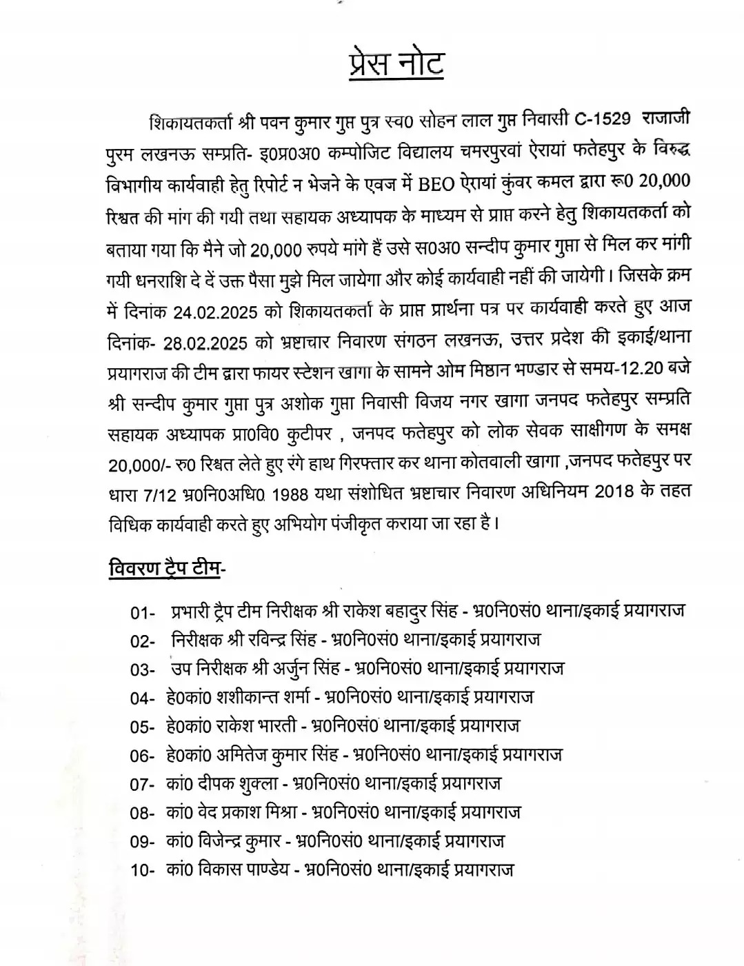 लखनऊ के राजाजीपुरम निवासी पवन कुमार गुप्ता सेमौरी ग्राम सभा के मजरा चमरपुरवा स्थित कंपोजिट विद्यालय में इंचार्ज प्रधानाध्यापक हैं। शुक्रवार को दमकल के पास स्थित ओम मिष्ठान भंडार पर मौजूद थे। कुछ देर बाद वहां खागा के विजय नगर निवासी संदीप कुमार गुप्ता पहुंचे। संदीप प्राइमरी विद्यालय कुटीपुर खागा में सहायक अध्यापक के पद पर तैनात हैं। इस दौरान पवन ने उन्हें 20 हजार रुपये दिए। संदीप कुमार ने रुपये पास रख लिए। इसी समय भ्रष्टाचार निवारण संगठन की प्रयागराज टीम के निरीक्षक राकेश बहादुर सिंह, रवींद्र सिंह, उप निरीक्षक अर्जुन सिंह ने संदीप को पकड़ लिया। उनके पास से रिश्वत का 20 हजार रुपये बरामद कर लिए।