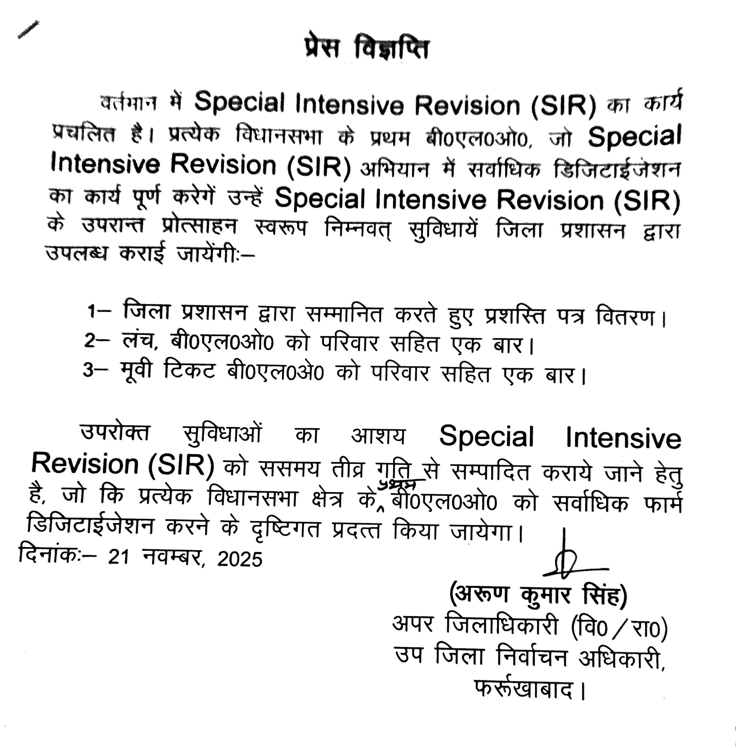 अपर जिलाधिकारी (वि0/रा0) उप जिला निर्वाचन अधिकारी अरूण कुमार सिंह ने जानकारी देते हुए बताया कि वर्तमान में विशेष गहन पुनरीक्षण (एसआईआर) का कार्य प्रचलित है। प्रत्येक विधानसभा के प्रथम बीएलओ जो विशेष गहन पुनरीक्षण (एसआईआर) अभियान में सर्वाधिक डिजिटाईजेशन का कार्य पूर्ण करेगें, उन्हें विशेष गहन पुनरीक्षण (एसआईआर) के उपरान्त प्रोत्साहन स्वरूप सुविधायें जिला प्रशासन द्वारा उपलब्ध कराई जायेंगी। जिसमें जिला प्रशासन द्वारा सम्मानित करते हुए प्रशस्ति पत्र वितरण। लंच, बीएलओ को परिवार सहित एक बार। मूवी टिकट बी0एल0ओ0 को परिवार सहित एक बार।। शामिल है। उपरोक्त सुविधाओं का आशय विशेष गहन पुनरीक्षण (एसआईआर) को ससमय तीव्र गति से सम्पादित कराये जाने हेतु है, जो कि प्रत्येक विधानसभा क्षेत्र के बीएलओ को सर्वाधिक फार्म डिजिटाईजेशन करने के दृष्टिगत प्रदत्त किया जायेगा।