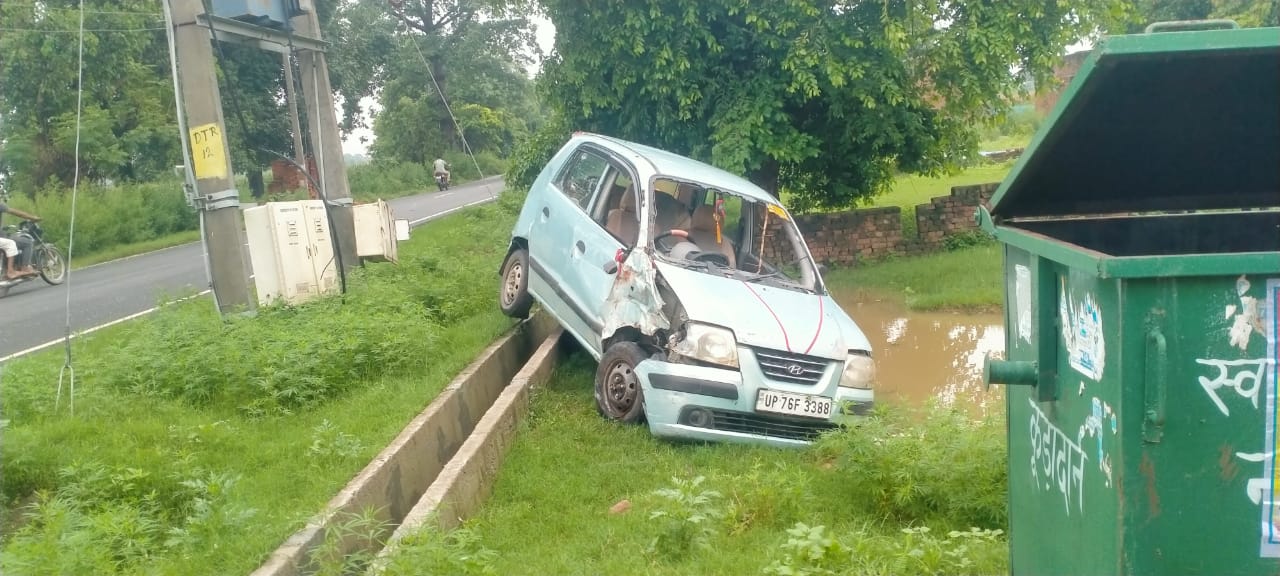 ट्रांसफार्मर की बाउन्ड्री से कार टकराकर तार में फंसी