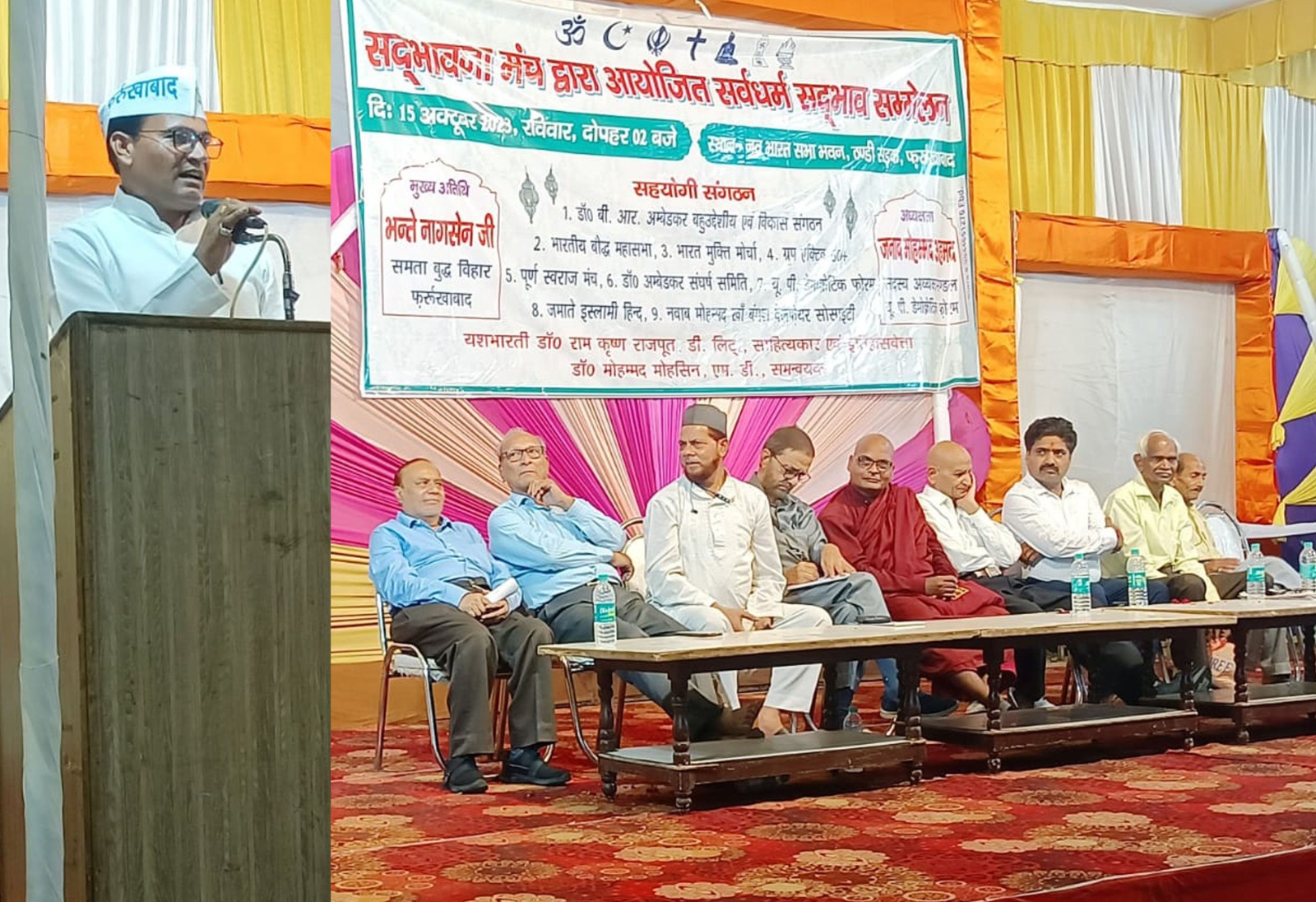 सद्भावना मंच द्वारा सर्वधर्म सम्मेलन का हुआ आयोजन फर्रुखाबाद, समृद्धि न्यूज। सद्भावना मंच के तत्वाधान में सर्वधर्म सद्भाव सम्मेलन का आयोजन ठंडी सड़क स्थित नव भारत सभा भवन में आयोजित हुआ। मुख्य अतिथि भंते नागसेन ने कहा कि अपने धर्म को बढ़ा और दूसरे धर्म की आलोचना करने वालों की निंदा करता हूं। उन्होंने पंचशीलों की व्यवस्था करते हुए जल, हवा, धूप तथा मिट्टी को सनातन बताया। सभी चीजे सर्वजन्य सुविधाजनक तथा त्रिकालसत्य वाली है। उन्होंने विश्व के हुए युद्धों की विभीषिका का भी उल्लेख किया। शांति और अंहिसा के विचारों का समर्थन किया। दिल्ली से आये राष्ट्रीय उपमहासचिव वारिस अली ने अध्यक्षता करते हुए कहा कि सद्भावना विकास का प्रतीक है और दुर्भावना विनाश का, संचालन करते हुए यश भारती डा0 रामकृष्ण राजपूत ने कहा कि संविधान की सुरक्षा अल्पसंख्यकों, अनुसूचितों, पिछड़ों को संविधान में दिये गये मौल्लिक अधिकारों की तरह ही सुरक्षा होनी चाहिए। उनके अनुसार यह सम्मेलन सभी को जोडऩे धर्माधता और औपनिषकता आतंकवाद के खिलाफ है। उपनिवेश वाद और आर्थिक गुलामी का खतरा आज भी देश के ऊपर है। वक्ताओं में जैन धर्म के पुखराज डागा, पारसी धर्म के जीनू शाह, बौद्ध धर्म के आशाराम बौद्ध, बार एसोसिएशन के जिलाध्यक्ष जवाहर सिंह गंगवार, अटेवा जिलाध्यक्ष नरेन्द्र सिंह जाटव, युनूस अंसारी, हसनैन खां, सुनील कटियार आदि को शाल ओड़ाकर सम्मानित किया गया। संचालन डा0 मोहम्मद मोहसीन ने किया। इस मौके पर मोहम्मद नासिर, अहमद आदिल, सतीश चन्द्र, नानक चन्द्र, शिवकुमार, शिवरतन शाक्य, भोजराज शाक्य, देवकीनंदन, होरीलाल, राजेन्द्र पाल, चन्द्रशेखर वर्मा आदि लोग मौजूद रहे।