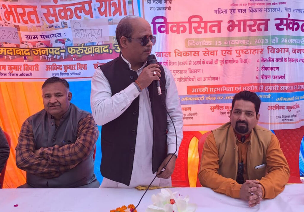 सदर विधानसभा क्षेत्र के ग्राम भगुआ नगला और चांदपुर में युवा मोर्चा प्रदेश अध्यक्ष एमएलसी प्रांशु दत्त द्विवेदी ने विकसित भारत संकल्प यात्रा के माध्यम से आम जनमानस को जनकल्याणकारी योजनाओं का लाभ लेने का आवाह्न किया। उन्होंने कहा विकसित भारत का संकल्प तभी पूर्ण होगा। जब गांव गरीब और किस का विकास होगा इसलिए यह अभियान भारत को विकसित करने के लिए चलाए जा रहा है। इस अवसर पर जिला उपाध्यक्ष प्रदीप सिंह रामदास गुप्ता आदि लोग मौजूद रहे। मोहम्मदाबाद क्षेत्र के ग्राम कांधेमई और बालीपुर भगवंत में पूर्व विधायक कुलदीप गंगवार ने कार्यक्रम में उपस्थित लोगों को संबोधित किया। इस दौरान जिला महामंत्री सुनील रावत आदेश राठौर आदि लोगों उपस्थित रहे। अमृतपुर विधानसभा क्षेत्र के ग्राम हरसिंहपुर गहलवार और परतापुर कलान में कार्यक्रम में मुख्य अतिथि विधायक सुशील शाक्य ने कहा भारत को विकसित करना प्रधानमंत्री नरेंद्र मोदी का संकल्प है और इस संकल्प को पूर्ण करने के लिए प्रत्येक आम जनमानस की आहुति आवश्यक है। इस अवसर पर अतुल दीक्षित, मनोज मिश्रा, आलोक बाजपेई आदि लोग मौजूद रहे।