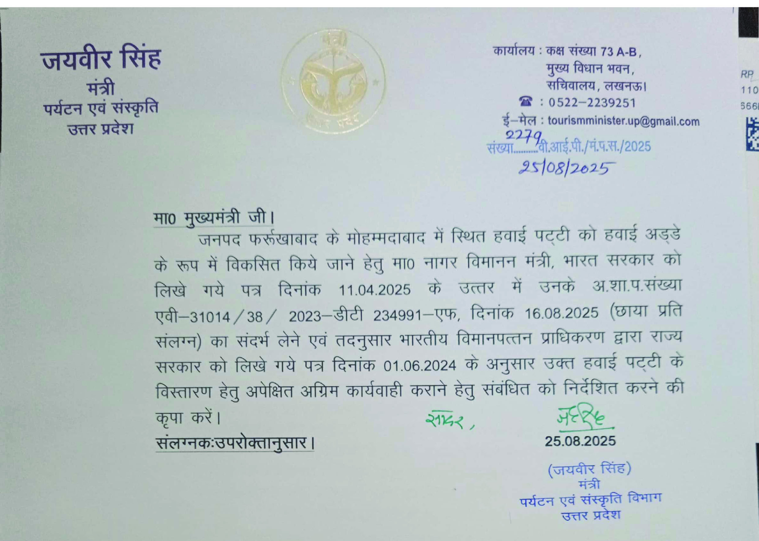 फर्रुखाबाद हवाई पट्टी के विस्तारण हेतु अग्रिम कार्यवाही के लिए पर्यटन मंत्री ने मुख्यमंत्री को लिखा पत्र