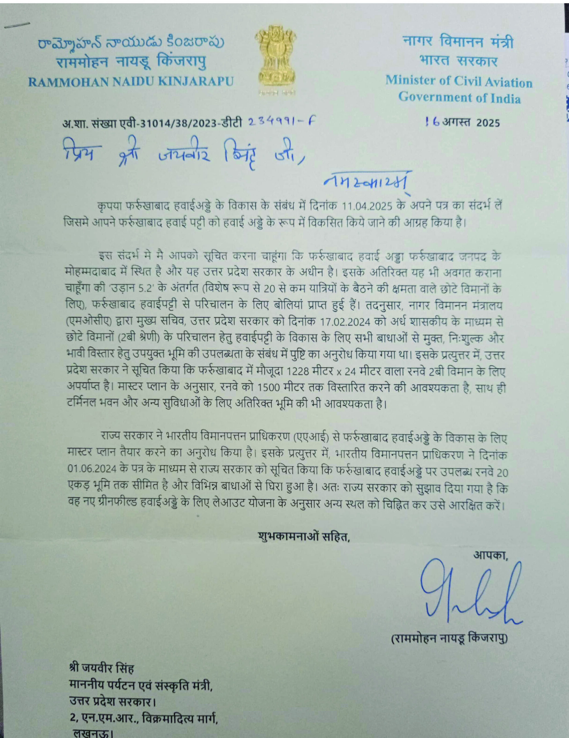 नागर विमानन मंत्री राममोहन नायडू किंजरापु ने पर्यटन मंत्री उ0प्र0 को लिखे १६ अगस्त के पत्र में कहा कि फर्रुखाबाद हवाई अड्डा फर्रुखाबाद जनपद के मोहम्मदाबाद में स्थित है और यह उत्तर प्रदेश सरकार के अधीन है। इसके अतिरिक्त यह भी अवगत कराना चाहूँगा की उड़ान 5.2 के अंतर्गत (विशेष रूप से 20 से कम यात्रियों के बैठने की क्षमता वाले छोटे विमानों के लिए, फर्रुखाबाद हवाईपट्टी से परिचालन के लिए बोलियां प्राप्त हुई हैं। तदनुसार, नागर विमानन मंत्रालय द्वारा मुख्य सचिव, उत्तर प्रदेश सरकार को 17 फरवरी 2024 को अर्ध शासकीय के माध्यम से छोटे विमानों (2बी श्रेणी) के परिचालन हेतु हवाईपट्टी के विकास के लिए सभी बाधाओं से मुक्त, नि:शुल्क और भावी विस्तार हेतु उपयुक्त भूमि की उपलब्धता के संबंध में पुष्टि का अनुरोध किया गया था।
