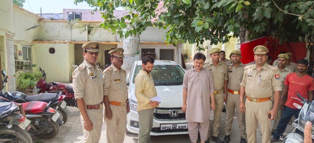 उपनिरीक्षक कैलाश बाबू अपने हमराह कांस्टेबिल देवेंद्र सिंह, विजेंदर सिंह, एसओजी प्रभारी अमित गंगवार अपने हमराह पुष्पेंद्र विक्रम सिंह, प्रवीण कुमार रामू यादव, अमर कुमार वर्मा, सचिन कुमार, कपिल कुमार के साथ जहानगंज रोड पर मिर्जा नगला के पास संदिग्ध व्यक्तियों की एवं वाहनों की चेकिंग कर रहे थे, तभी मुखबिर की सूचना पर एक होंडा सिटी कार को रुकने का इशारा किया तो चालक ने गाड़ी भगा दिया। जिसे पुलिस कर्मियों ने घेर कर रोक लिया। चालक खिड़की खोलकर भागने का प्रयास करने लगा। पुलिस ने दोनों व्यक्तियों को पकड़ लिया। पूछताछ के दौरान एक ने अपना नाम सुनील कुमार पुत्र स्वर्गीय मनीराम निवासी मोहनपुर दिनारपुर नई बस्ती बताया तथा दूसरे ने अपना नाम अरशद मेराज पुत्र मेराज अहमद निवासी मोहल्ला दाऊद थाना शमशाबाद बताया। तलाशी में सुनील के पास से एक पिस्टल व आठ जिंदा कारतूस 32 बोर के बरामद हुए तथा ३४०० रुपये की नगदी, एक सोने की चैन बरामद हुई। बरामद पिस्टल एवं कारतूसो के संबंध में जब लाइसेंस मांगा गया तो आरोपी ने बताया कि मेरे दूर के चाचा खुमान सिंह निवासी भोलेपुर कि यह पिस्टल है। कार के प्रपत्र दिखाने के कहने पर नहीं दिखा सका। कार का रजिस्ट्रेशन नंबर एप पर डालकर चेक किया गया तो यह नंबर सुपर स्प्लेंडर मोटरसाइकिल का निकला। बाइक स्वामी मनोज कुमार पुत्र रामनरेश निवासी सेक्टर एम अलीगंज लखनऊ स्थाई पता सरौरा कलान सीतापुर का है। इंजन नंबर से ज्ञात हुआ कार स्वामी गजेंद्र कुमार पुत्र बालिस्टर सिंह निवासी कयामपुर बहेडिया जिला कासगंज है। वाहन स्वामी से उसके मोबाइल नंबर पर बात करने पर गजेंद्र सिंह ने बताया कि मेरी गाड़ी मेरे पास है। पूछताछ के दौरान आरोपियों ने बताया कि उक्त दोनों एक पेट्रोल पम्प पर कार्य करते है। आरोपियों ने गाड़ी करीब डेढ़ वर्ष पूर्व अलीगढ़ से चोरी की खरीदी थी। हम लोगों ने गाड़ी का रजिस्ट्रेशन नंबर एवं गाड़ी पर अंकित चेचिस नंबर में आईएम के स्थान पर ई तथा 4110 के स्थान पर 3848 करवा दिया था। जिससे हम लोग पकड़े ना जाएं। पुलिस ने सुनील एवं अरशद के विरुद्ध धारा 41, 411, 420, 467, 468, 471 एवं 3/25 एवं लाइसेंस धारक खुमान सिंह पुत्र स्वर्गीय मंगूलाल निवासी भोलेपुर थाना फतेहगढ़ के खिलाफ 30ए में मुकदमा दर्ज कर सुनील एवं अशरद को जेल भेजा।