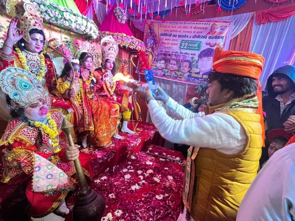 फर्रुखाबाद, समृद्धि न्यूज। श्रीराम मंदिर प्राण प्रतिष्ठा समारोह के बाद हर जगह धार्मिक कार्यक्रमों के आयोजन हो रहे है। फर्रुखाबाद रोडवेज बस स्टैण्ड के निकट स्थित शिव मंदिर पर आयोजित रामलीला कार्यक्रम में बतौर मुख्य अतिथि के रुप में शामिल होकर भाजपा नेता विकास राजपूत ने प्रभु श्रीराम- माता सीता, लक्ष्मण, हनुमान भगवान स्वरूपों की आरती उतारकर पूजा अर्चना की और आशीर्वाद लिया।