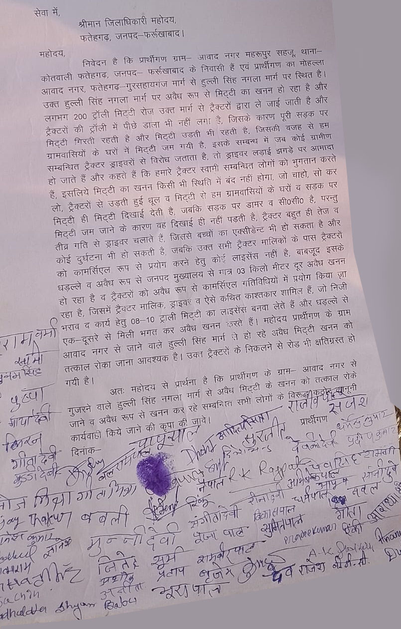 कोतवाली फतेहगढ़ के क्षेत्र महरुपुर सहजू के ग्राम आबाद नगर के ग्रामीणों ने जिलाधिकारी को दिये गये प्रार्थना पत्र में दर्शाया कि हुल्ली सिंह नगला मार्ग पर अवैध रूप से मिट्टी का खनन हो रहा है और लगभग 200 ट्रॉली मिट्टी रोज उक्त मार्ग से ट्रैक्टरों द्वारा ले जाई जाती है। ट्रैक्टरों की ट्रॉली में पीछे डाला भी नहीं लगा है, जिसके कारण पूरी सडक़ पर मिट्टी गिरती रहती है और मिट्टी उड़ती भी रहती है। जिसकी वजह से हम ग्रामवासियों के घरों में मिट्टी जमा गयी है। इसके सम्बन्ध में जब कोई ग्रामीण सम्बन्धित ट्रैक्टर ड्राइवरों से विरोध जताता है, तो ड्राइवर लड़ाई झगड़े पर आमादा हो जाते हैं और कहते हैं कि हमारे मालिक सम्बन्धित अधिकारियों को इसी बात का पैसा देते है। जिससे हमें कोई रोंके ना। इसलिये मिट्टी का खनन किसी भी स्थिति में बंद नहीं होगा। जहां चाहे शिकायत कर आओ।