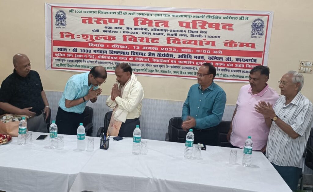 कंपिल, समृद्धि न्यूज। नगर स्थित श्री विमलनाथ दिगम्बर जैन मंदिर में अखिल भारतीय संस्था तरुण मित्र परिषद द्वारा विराट दिव्यांग कैम्प का आयोजन किया गया। जिलाधिकारी संजय कुमार सिंह ने विमलनाथ भगवान के चित्र के समक्ष दीप प्रज्ज्वलित कर उद्घाटन किया। कार्यक्रम के संचालक अशोक जैन ने बताया कि तन्नूलाल व किरणमाला जैन की स्मृति में दिल्ली के प्रमुख समाजसेवी अतुल, अजय, अभय व अचल जैन परिवार के सहयोग से आयोजित इस 48वें विराट दिव्यांग कैम्प में दिव्यांगों व श्रवणहीन बुजुर्गों द्वारा आवेदन किया गया। जिसमें से कृत्रिम पैर, कृत्रिम हाथ पोलियोग्रस्त बच्चों को कैलिपर्स, आर्थोशूज, स्टिक, बैसाखियां, वाकर व हैंडगलोव के अतिरिक्त श्रवणहीन बुजुर्गों को श्रवण यंत्र उपलब्ध कराने हेतु चयन कर नाप लिया गया। सहसचिव आलोक जैन के अनुसार यह सभी सहायक उपकरण 27 अगस्त को यहीं प्रदान किए जायेंगे। इस अवसर पर उपजिलाधिकारी यदुवंश कुमार वर्मा, राकेश जैन, राम किशोर शर्मा व अतुल, अजय, अभय व अचल जैन, अनुराग जैन आदि समाजसेवी उपस्थित रहे।