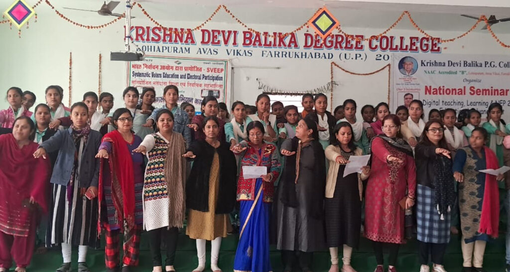 फर्रुखाबाद, समृद्धि न्यूज। कृष्णा देवी बालिका डिग्री कालेज लोहियापुरम् आवास विकास में जिला निर्वाचन अधिकारी के निर्देशन में चल रहे मतदाता जागरूकता अभियान स्वीप के अन्तर्गत भारती मिश्रा द्वारा मतदाता शपथ कार्यक्रम का आयोजन किया गया। प्राचार्या डा0 प्रेमलता श्रीवास्तव द्वारा कार्यक्रम का विधिवत शुभारम्भ किया गया। भारती मिश्रा ने समस्त छात्राओं को यह जानकारी दी कि जिनकी आयु 18 वर्ष पूर्ण हो गयी है वे सभी अपना मतदाता पहचान पत्र बनवायें और आगामी चुनावों में अपने मत का प्रयोग करें। प्राचार्य ने कहा कि भारत विश्व में सबसे बड़ा लोकतांत्रिक देश है। इसके मूल्यों की सुरक्षा करने हेतु आवश्यक है कि हम सब जागरूक नागरिक बनें। कार्यक्रम में भारती मिश्रा ने सभी को मतदाता शपथ दिलायी। इस अवसर पर कंचन राजपूत, प्रतीक्षा, ज्योति अग्निहोत्री, उमा देवी, लक्ष्मी देवी को विद्यालय में कैम्पस एमवेस्डर चुना गया। कंचन सारस्वत तथा डा0 ज्ञान प्रकाश सक्सेना को स्वीप प्रभारी का दायित्व सौंपा गया। इस अवसर पर सुलेखा कुशवाहा, गीता भारद्वाज, सरोज यादव, संजय राजपूत, योगेश शाक्य, अवधेश यादव, रीना कश्यप, प्रतिभा सिंह, राजेश कुमार, प्रशान्त, दीप्ती सिंह आदि उपस्थित रहे।