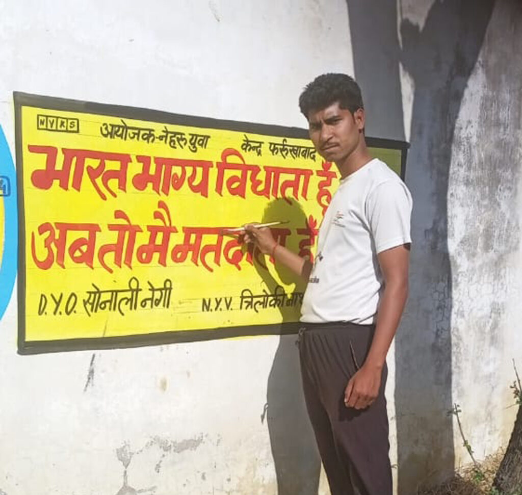 फर्रुखाबाद, समृद्धि न्यूज। नेहरू युवा केन्द्र युवा कार्यक्रम खेल मंत्रालय भारत सरकार के द्वारा ग्रामीण क्षेत्रों में मतदाता जागरूकता अभियान कार्यक्रम चलाया जा रहा है। जिसके तहत शपथ ग्रहण, गोष्टी, नुक्कड़ नाटक, बाल पेंटिंग, पोस्टर प्रतियोगिता आदि का आयोजन किया गया। ब्लाक शमशाबाद के राष्ट्रीय युवा स्वयंसेवक त्रिलोकी नाथ ने दीवाल पर पेंटिंग कराकर ग्रामीणों को जागरूक किया। भारत भाग्य विधाता हूं, अब तो मैं मतदाता हूं।