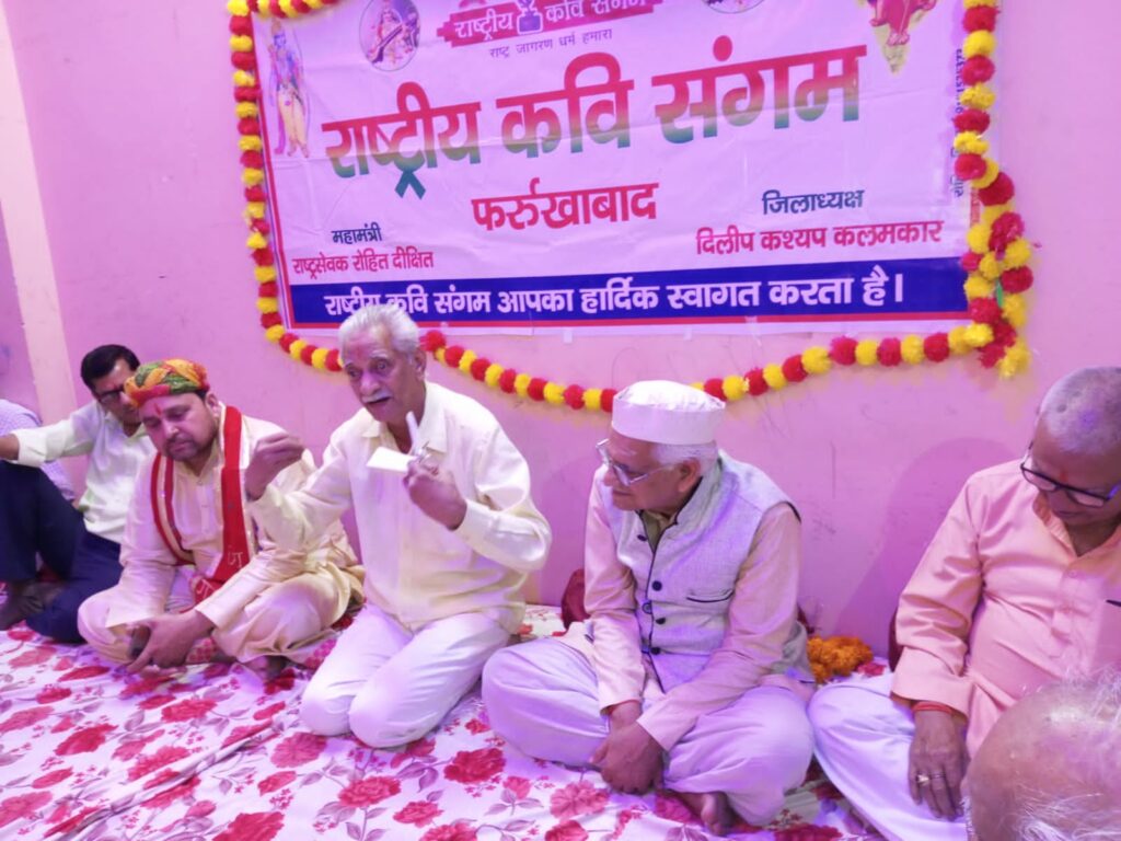 फर्रुखाबाद, समृद्धि न्यूज। राष्ट्र भावना को समर्पित साहित्यिक संस्था राष्ट्रीय कवि संगम के बैनर तले भगवान श्रीराम जन्मोत्सव के मौके पर काव्य गोष्ठी का आयोजन बजरिया स्थ्ज्ञित वरिष्ठ छंदकार रामअवतार शर्मा इंदू के निवास पर कवि ज्योतिस्वरुप अग्निहोत्री की अध्यक्षता में हुआ। मुख्य अतिथि राष्ट्रीय स्तर के कवि डा0 शिवओम अम्बर रहे व विशिष्ठ अतिथि के तौर पर संस्कार भारतीय के प्रांतीय महामंत्री सुरेन्द्र पाण्डेय मौजूद रहे। कार्यक्रम का संचालन संस्था के अध्यक्ष दिलीप कश्यप कलमकार ने किया। डा0 शिवओम अम्बर ने भगवान राम को समर्पित रचना में कहा कि बिना राम के आदर्शों का चर्माेत्कर्ष कहां है। बिना राम के इस भारत में भारतवर्ष कहां है। विशिष्ट अतिथि सुरेंद्र पाण्डेय ने मानस की पंक्तियां पढ़ते हुए कहा कि जब जब धर्म की हानि होती है तब तब प्रभु अवतार लेकर निशाचरी शक्तियों का नाश करते है। अध्यक्षता कर रहे कवि ज्योति स्वरूप अग्निहोत्री ने हमारे हरि सों कौन उदार, पद पढ़कर माहौल को भक्तिमय बना दिया। बृजकिशोर सिंह किशोर ने पढ़ा आपकी मुस्कान के परिणाम दिखते है आईने को हम उमर खय्याम दिखते हैं।