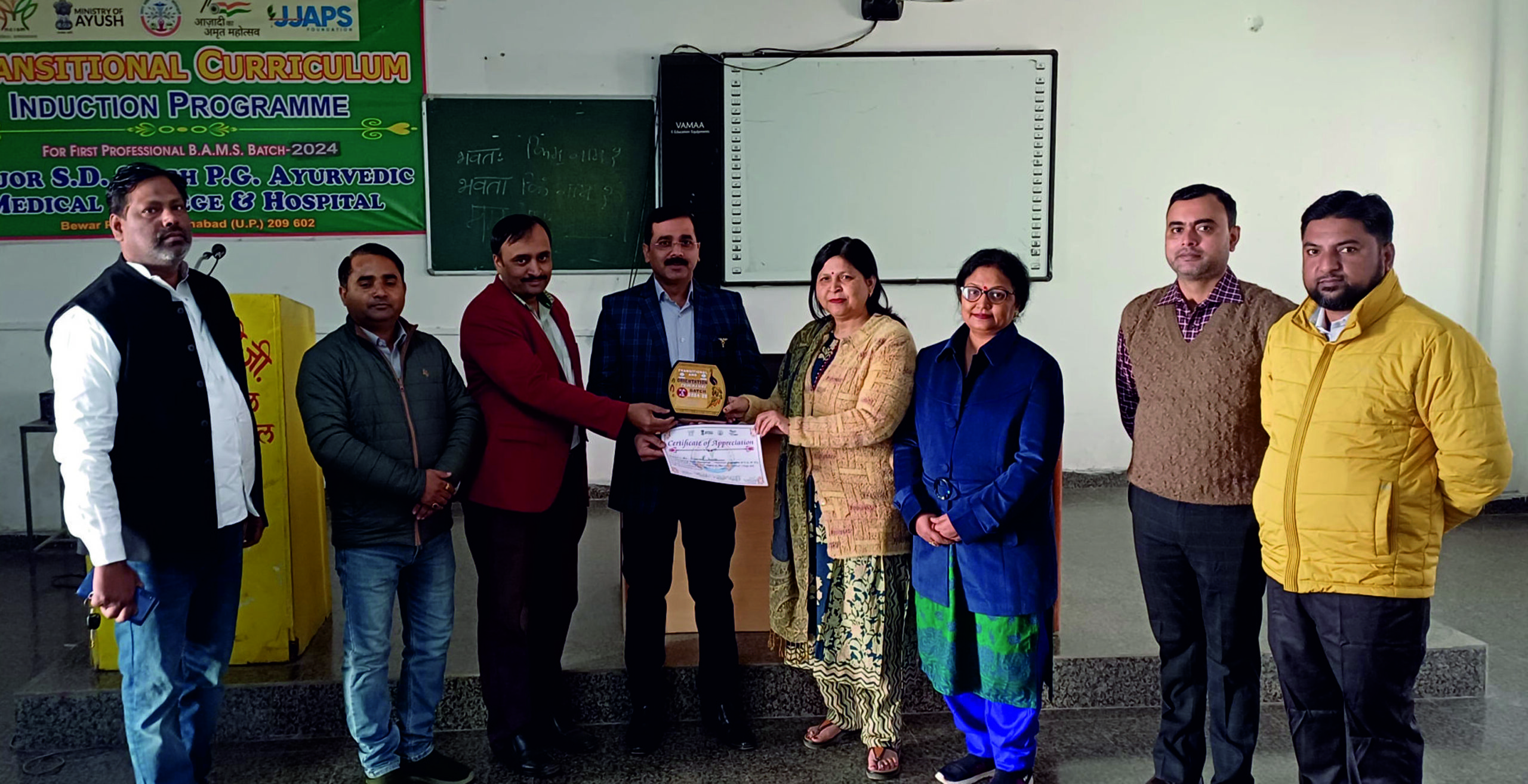 फर्रुखाबाद, समृद्धि न्यूज। मेजर एस0डी0 सिंह पी0जी0 आयुर्वेदिक मेडिकल कॉलेज एण्ड हॉस्पिटल में चल रहें 2024 बैच के ट्रॉजीशनल एवं ओरिएन्टेशन प्रोग्रम के आठवें दिन लिंजीगंज के चिकित्साधिकारी डॉ0 नवनीत गुप्ता ने बच्चों को स्वस्थ रहने के नियम और चिकित्सा करने के नियम समझायें। उन्होनें छात्रों को जल्दी निराश न होने के लिये समझाया। उनका धन्यवाद डॉ0 मुकेश विश्वकर्मा ने देते हुए कहां कि आज हम बहुत भाग्यशाली हैं, क्योंकि हमारे बीच डॉ0 नवनीत गुप्ता ने अपना कीमती समय दिया। डॉ0 नवनीत गुप्ता को कॉलेज की प्राचार्या डॉ0 अंजना दीक्षित ने स्मृति चिन्ह एवं प्रमाण पत्र देकर सम्मानित किया। डॉ0 संकल्प सिंह जो कि कॉलेज के चीफ प्राक्टर है उन्होनें छात्र/छात्राओं को अनुशासन में रहने का तरीका बताया और बच्चों को समय का सदुपयोग करने को कहा।