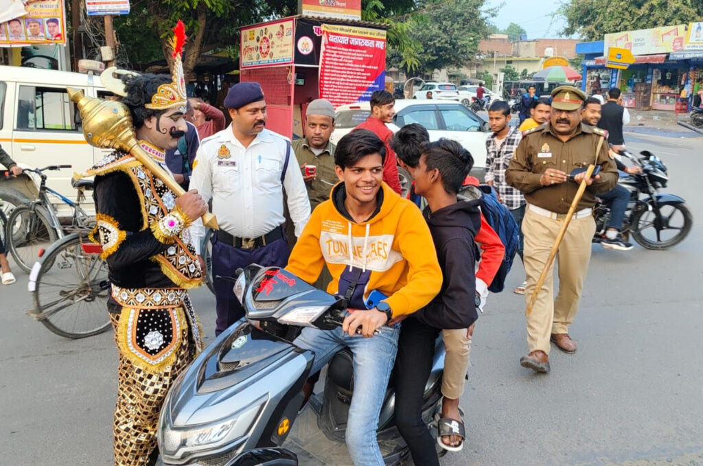 जानकारी के अनुसार मार्ग दुर्घटनाओं के तेजी से बढ़ रहे ग्राफ को कम करने के लिए पुलिस यातायात माह आदि चलाकर वाहन चालकों को यातायात के प्रति जागरुक करती ही है, लेकिन पुलिस ने लोगों को यातायात के नियमों के प्रति जागरुक करने के लिए अब यमराज का सहारा लिया है। जो वाहन चालकों को यातायात नियमों का पालन करने तथा हेलमेट पहनने के प्रति जागरुक करेंगे। ऐसा ही नजारा शुक्रवार को नगर के तिराहे चौराहे पर देखने को मिला, जब यमराज के वेष में एक स्वरुप पुलिस के साथ हेलमेट न पहनने वाले वाहन चालकों को रोक-रोकर जागरुक करता नजर आया। लंबी दाड़ी मूंछ, हाथ में गदा लेकर तथा यमराज जैसा परिधान पहनकर जब यह स्वरुप सडक़ पर निकला, तो लोगों व बच्चों के बीच कौतूहल का विषय बन गया। जो भी वाहन चालक बगैर हेलमेट वाहन चलाता नजर आया, उसे रोककर उपरोक्त स्वरुप ने हेलमेट लगाने की सलाह दी। साथ ही कहा कि जब दुर्घटन होती, तो मनुष्य को यमराज ले जाते हैं। वहीं वाहन चालकों ने भी हेलमेट लगाने का उपरोक्त स्वरुप को आश्वासन दिया।