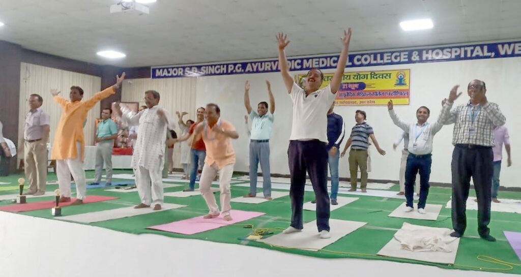मानसिक और शारीरिक शक्ति बढ़ाने के लिए नियमित योग आवश्यक: डा0 रवीन्द्र यादव . दिमाग और शरीर को स्वस्थ रखता है योग: डॉ0 सुनील कुमार गुप्ता . मोबाइल के अनावश्यक प्रयोग से बचें और ब्रह्म महुर्त में जरूर करें योग: डॉ अंजना दीक्षित फर्रुखाबाद, समृद्धि न्यूज। विश्व योग दिवस के अवसर पर मेजर एसडी सिंह पीजी आयुर्वेदिक मेडिकल कालेज एवं हॉस्पिटल में वृहद कार्यक्रम का आयोजन किया गया। महाविद्यालय के सेमिनार हाल में आयुर्वेदाचार्यों एवं विद्वतजनों ने भावी चिकित्सकों को योग करने के लिए प्रेरित तो किया ही साथ ही योग का अभ्यास भी कराया। इस अवसर पर मुख्य अतिथि बद्री विशाल महाविद्यालय के प्राचार्य डॉ0 चन्द्रधर यादव ने कहा कि नियमित योग करने से किसी भी पुरानी शारीरिक अथवा मानसिक बीमारी से मुक्ति पाई जा सकती है। डॉ0 चंद्रधर यादव ने कहा कि योग वह औषधि है जो ब्रह्माण्ड की किसी भी बीमारी को ठीक करने की क्षमता रखती है। उन्होंने कहा कि नियमित रोग करने से बीमारियां तो समाप्त होती ही हैं। साथ ही मन और चित्त भी शांत रहता है। प्रत्येक वर्ष योग दिवस मनाने का उद्देश्य लोगों को जागरूक करना है ताकि वे अभ्यास से मानसिक शारीरिक और बौद्धिक स्वास्थ्य को और अधिक बेहतर बना सकें। योग मानव की जीवनशैली में सकारात्मक बदलाव लाता है और स्वास्थ्य में मदद करता है। कार्यक्रम के अतिथि एवं चिकित्सक डा0 रवीन्द्र यादव ने कहा कि योग केवल एक शारीरिक व्यायाम नहीं है। योग वास्तव में मन और आत्मा की अनंत संभावनाओं को प्रकट करने का सबसे सतही पहलू है। उन्होंने कहा कि योग हमें सिखाता है कि किस प्रकार हम अपनी सांसों पर नियंत्रण पाकर अपने शरीर में चमत्कार कर सकते हैं। प्राचार्य डॉ0 सुनील कुमार गुप्ता ने कहा कि योग दिवस प्रतिवर्ष 21 जून को 2015 से मनाया जा रहा है। प्रधानमंत्री नरेन्द्र मोदी और योगाचार्य बाबा रामदेव के प्रयासों से आज योग समूचे विश्व में प्रसारित हो रहा है। उन्होंने कहा कि योग से आपके मस्तिष्क के कार्यों एकाग्रता और स्मृति में सुधार होता है। इसलिए विद्यार्थियों को अनिवार्य रूप से योग करना चाहिए। योग से रक्त परिसंचरण में सुधार होता है जो दिमाग और शरीर को स्वस्थ रखने के लिए बहुत आवश्यक है। मानसिक तनाव से निबटने में योग महत्वपूर्ण भूमिका निभाता है। क्रिया शरीर की विभागाध्यक्ष डॉ0 अंजना दीक्षित ने विद्यार्थियों में बढ़ते मोबाइल प्रेम पर चिन्ता जताते हुए कहा कि आज की पीढ़ी मोबाइल में ज्यादा व्यस्त रहने लगी है जिसका परिणाम यह होता है कि वो मोबाइल चलाते हुए अपनी आंखें और शरीर की उर्जा तो नष्ट कर ही रहे हैं साथ ही सुबह देर से उठकर अपना भविष्य भी अंधकार की ओर ले जा रहे हैं। उन्होंने कहा कि मोबाइल का अनावश्यक प्रयोग न करें और ज